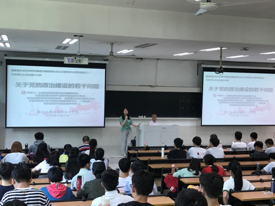 4月23日下午,我院诚邀全国党的建设研究会特邀研究员、全国党的建设教学与研究专委会学术委员、福建省委政研室特邀研究员、省委理论宣讲专家库专家、省委党校省行政学院原党建教研部主任、二级教授、党的建设研究基地首席专家李新生教授在海韵教学楼201教室作题为“关于党的政治建设的若干问题”的专题讲座。此次讲座由马克思主义学院教授、福建省社会科学研究基地中国特色社会主义研究中心首席专家兼常务副主任冯霞教授主持, 2017级上思想政治理论课的部分本科生到场参加。