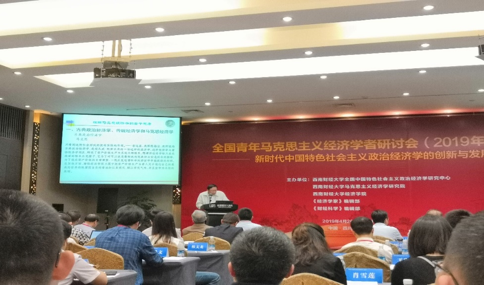 2019年4月20-21日,由全国中国特色社会主义政治经济学研究中心、西南财经大学马克思主义经济学研究院、西南财经大学经济学院主办的“2019年全国青年马克思主义经济学者研讨会——新时代中国特色社会主义政治经济学的创新与发展”在西南财经大学光华校区召开。本次论坛与会代表有来自复旦大学、浙江大学、南京大学、南开大学、武汉大学、四川大学、厦门大学、西北大学、河北经贸大学、江西财经大学等30多所高校的青年学者,我校宣传部副部长、马克思主义学院肖斌副教授及我院2017级硕士研究生艾小峰参加了此次论坛。