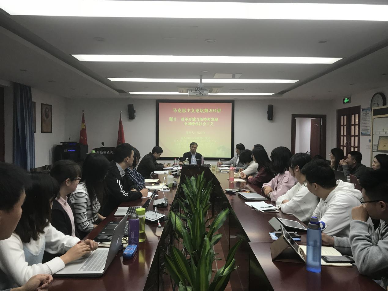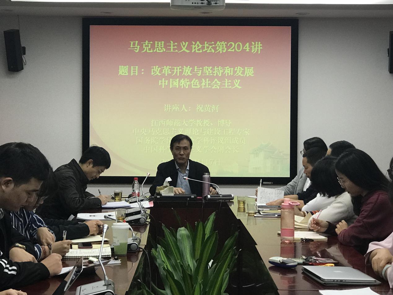 2018年12月17日,我院邀请到江西师范大学教授、中央马克思主义理论研究和建设工程专家、国务院学位委员会学科评议组成员、中国科学社会主义学会副会长祝黄河,在囊萤楼302作了题为“改革开放与坚持和发展中国特色社会主义”的精彩讲座。本次讲座由我院常务副院长张有奎教授主持,我院部分教师和硕、博研究生参加了此次讲座。