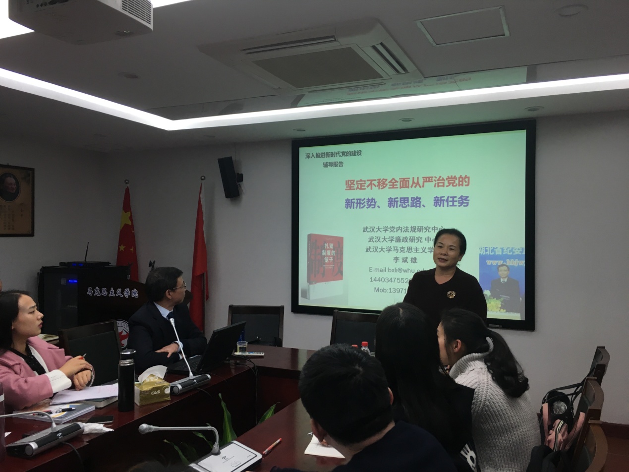 12月9日晚,我院邀请武汉大学党内法规研究中心副主任、武汉大学廉政研究中心副主任,武汉大学马克思主义学院二级教授、博士生导师李斌雄教授,在囊萤楼302作了题为“坚定不移全面从严治党的新形势、新思路、新任务”的精彩讲座。本次讲座由徐雅芬教授主持,我院2018全体硕士研究生,其他年级部分硕、博研究生参加了本次讲座。