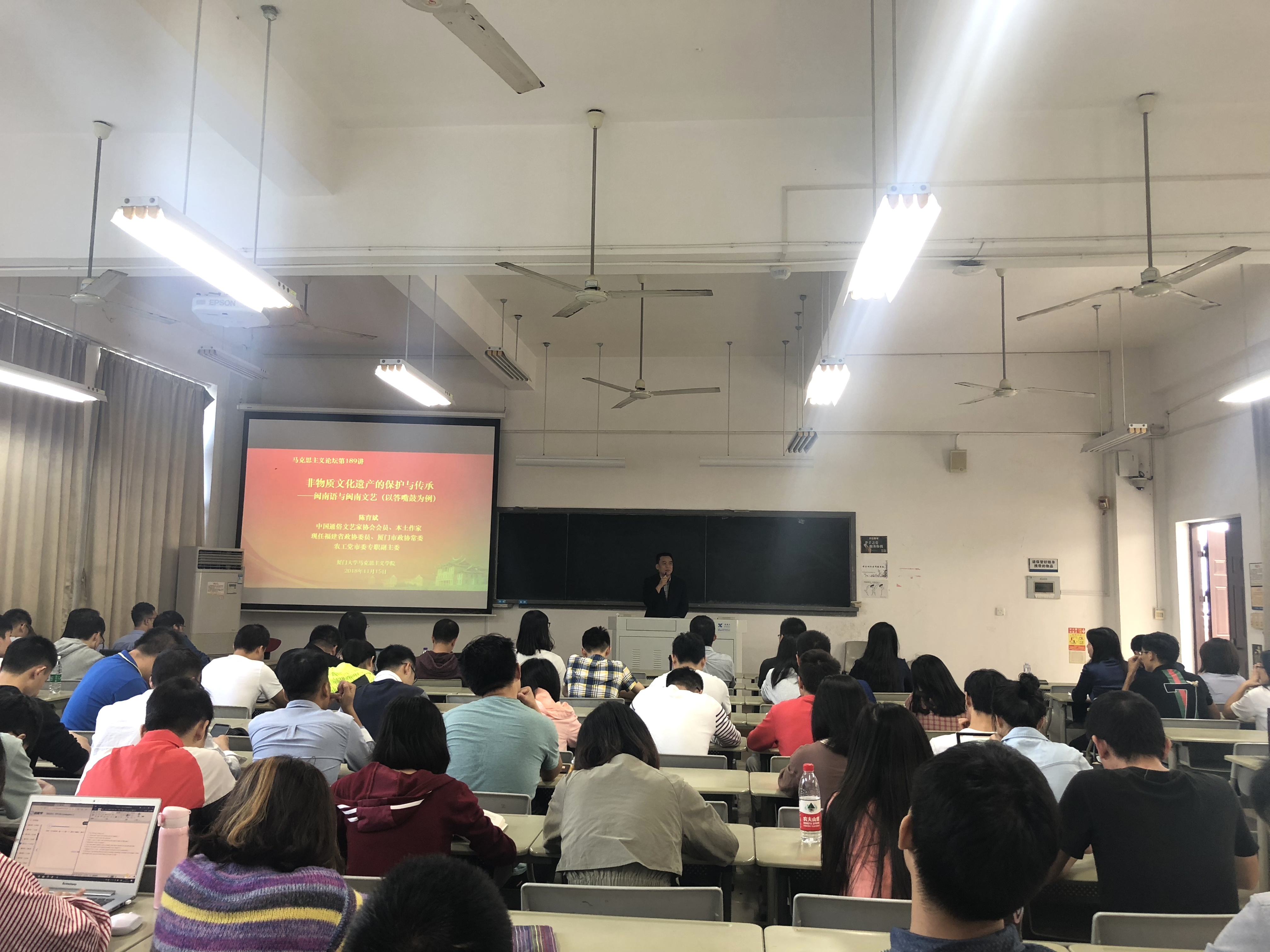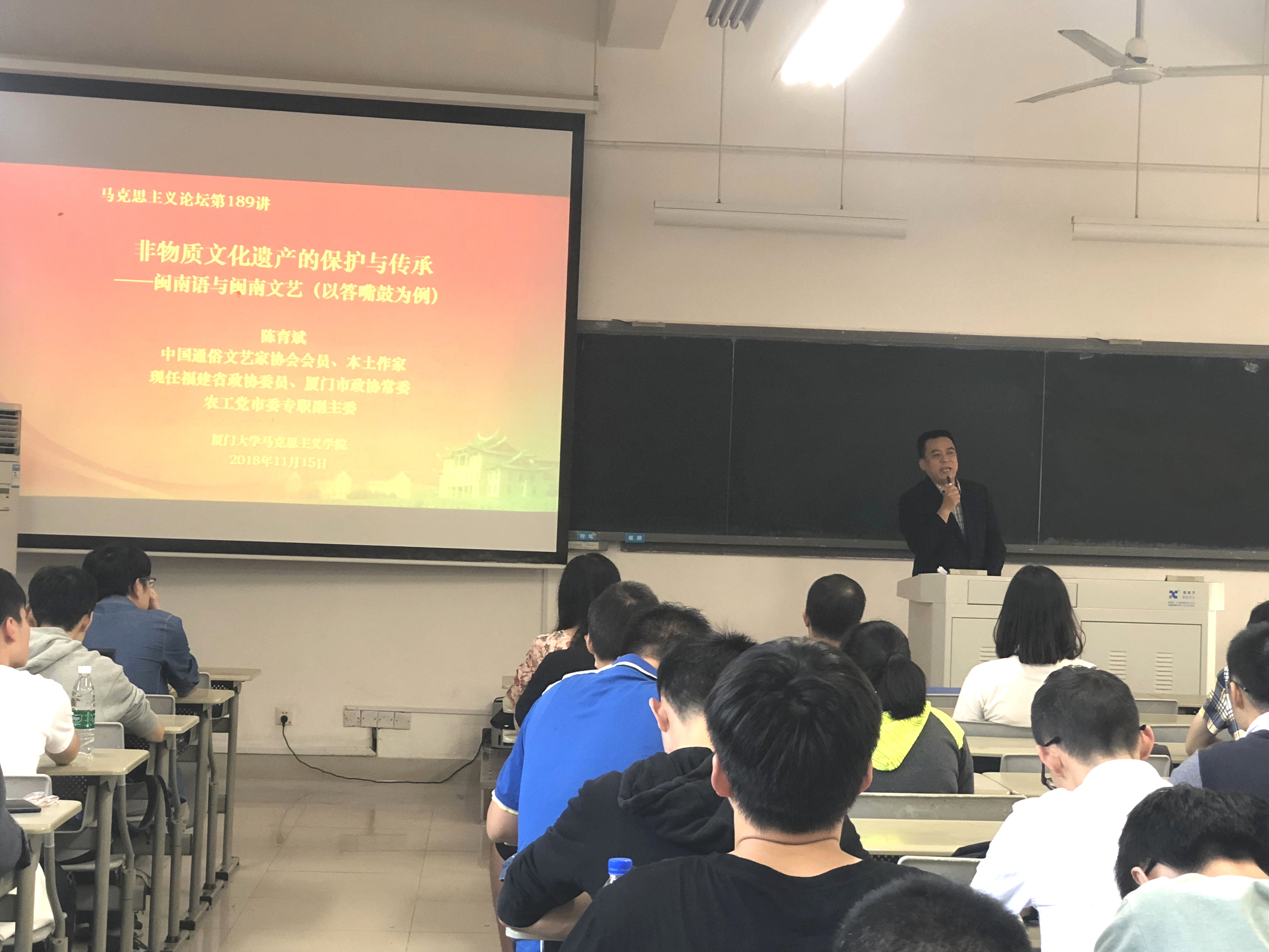 11月15日上午,我院邀请到中国通俗文艺家协会会员、本土作家、福建省政协委员、厦门市政协常委、农工党市委专职副主委陈育斌专家,在海韵教学楼202作了题为“非物质文化遗产的保护与传承——闽南语与闽南文艺(以答嘴鼓为例)”的精彩讲座。本次讲座由冯霞老师主持,100多名来自马克思主义学院、化学学院等18级博士生参加了此次讲座。