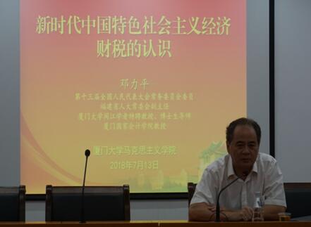 7月13日,我院邀请到第十三届全国人民代表大会常务委员会委员、厦门大学闽江学者特聘教授、博士生导师邓力平教授作了题为“新时代中国特色社会主义经济财税的认识”的讲座。本次讲座由院长白锡能主持,我院部分教师、研究生代表及来我院参加2018年优秀大学生夏令营活动的四十多名大学生参加了本次讲座。