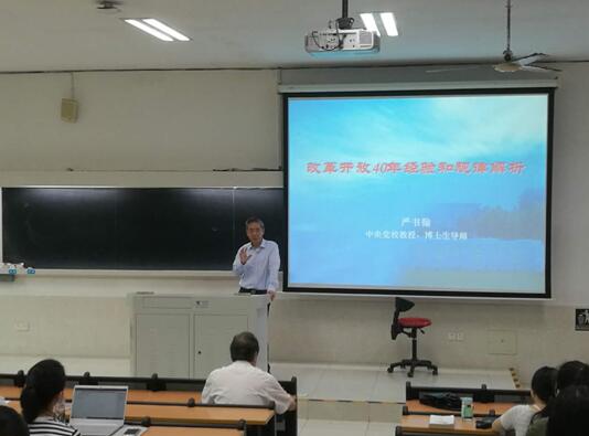 讲座伊始,严教授从人民群众的切身感受和党的文献表述叙述了四十年来我国改革开放发生的历史性变化,论证了改革开放是中国发生历史性变化的根本原因。改革开放极大解放和发展了社会生产力、成功开辟了中国特色社会主义道路、充分显示了中国力量和社会主义制度优越性、为人类和平与发展作出了中国贡献。从1978年改革开放迫在眉睫到如今新时代起点上推进全面深化改革,正如习近平总书记所说的“没有改革开放,就没有中国的今天;离开改革开放,也没有中国的明天”。