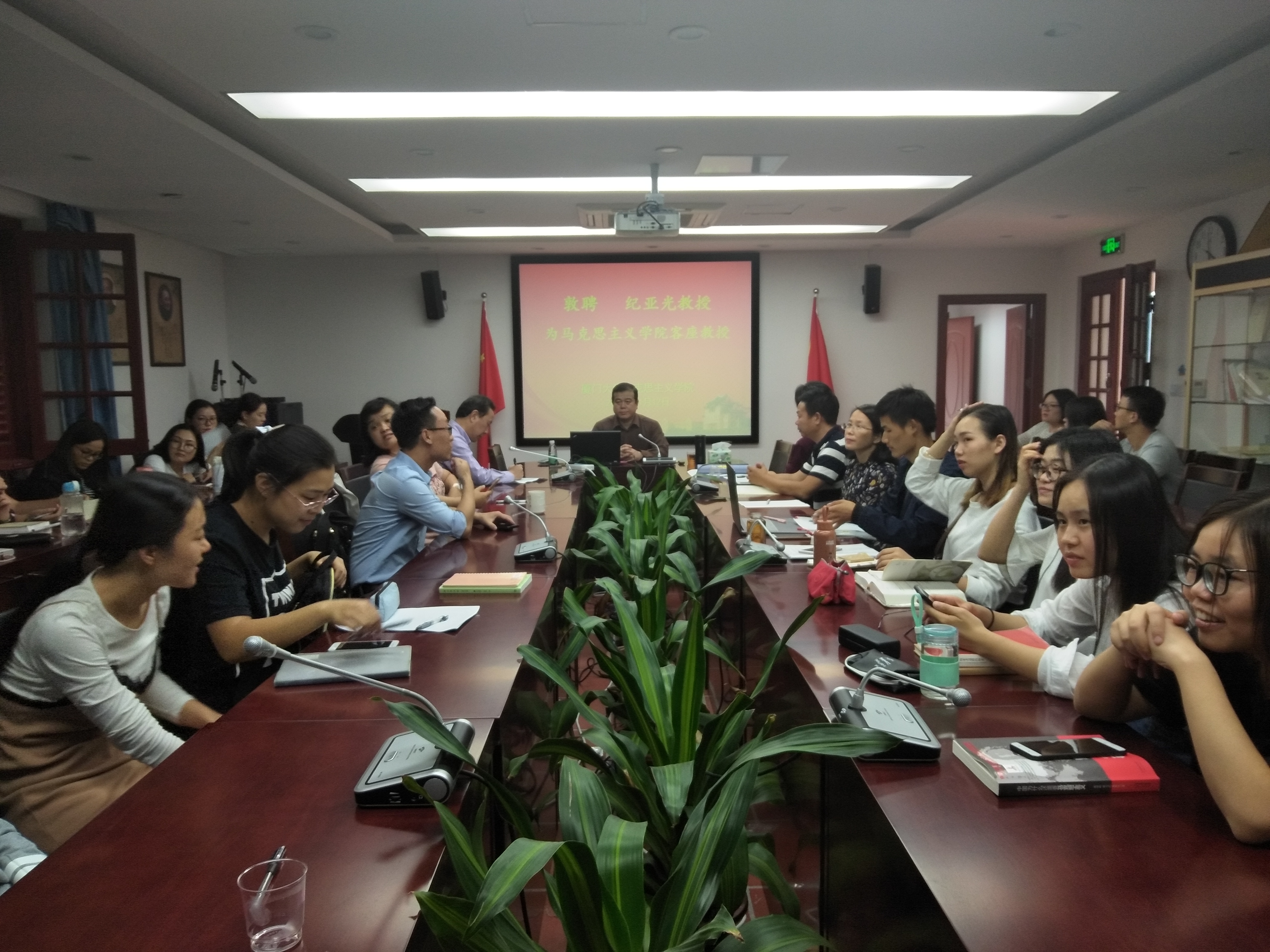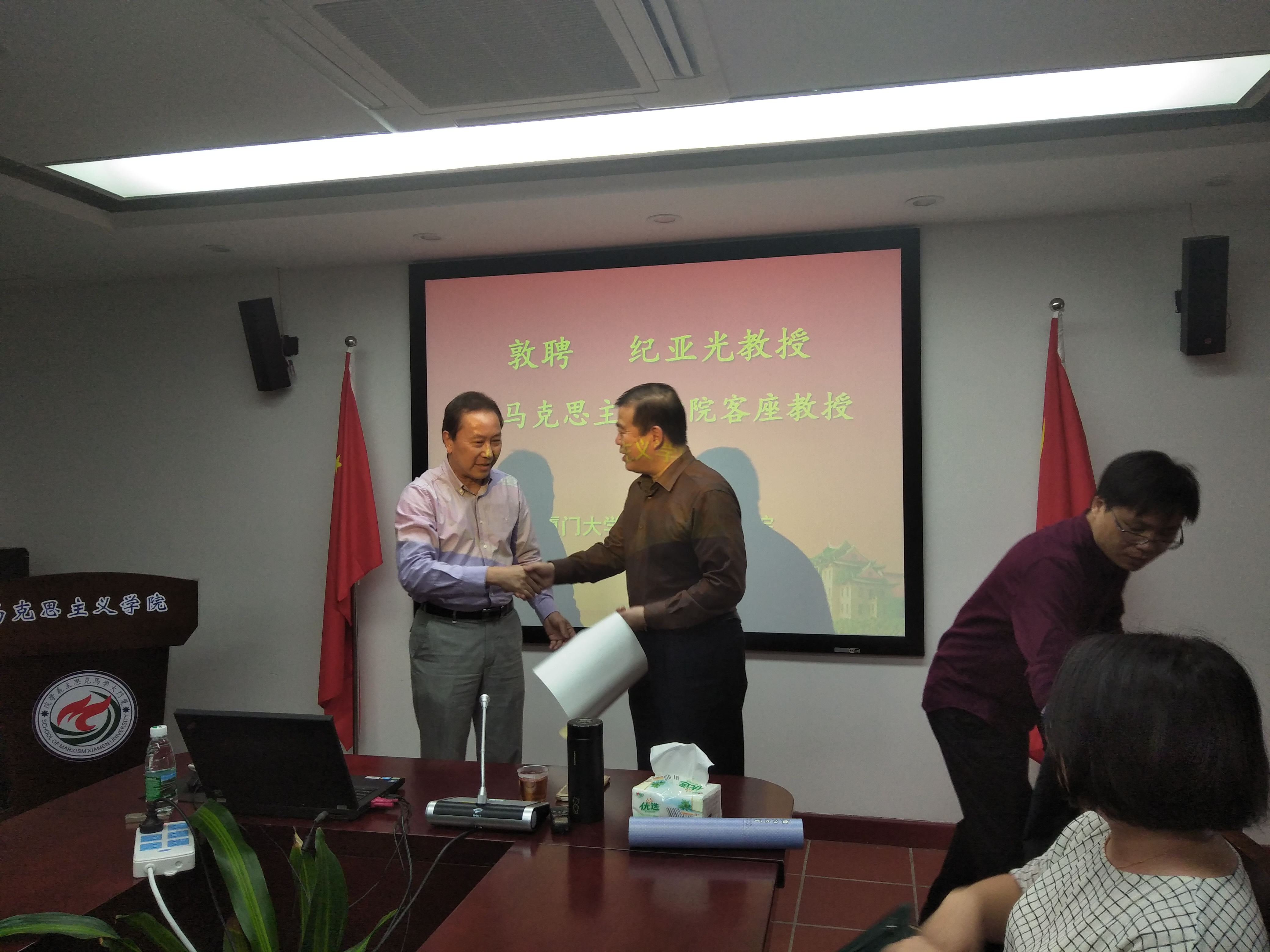 2017年11月12日下午,我院于囊萤楼302会议室举办了敦聘南开大学研究生院常务副院长、博士生导师纪亚光教授为马克思主义学院兼职教授的授职仪式,由我院白锡能院长为纪亚光教授颁发聘任证书,并合影留念。