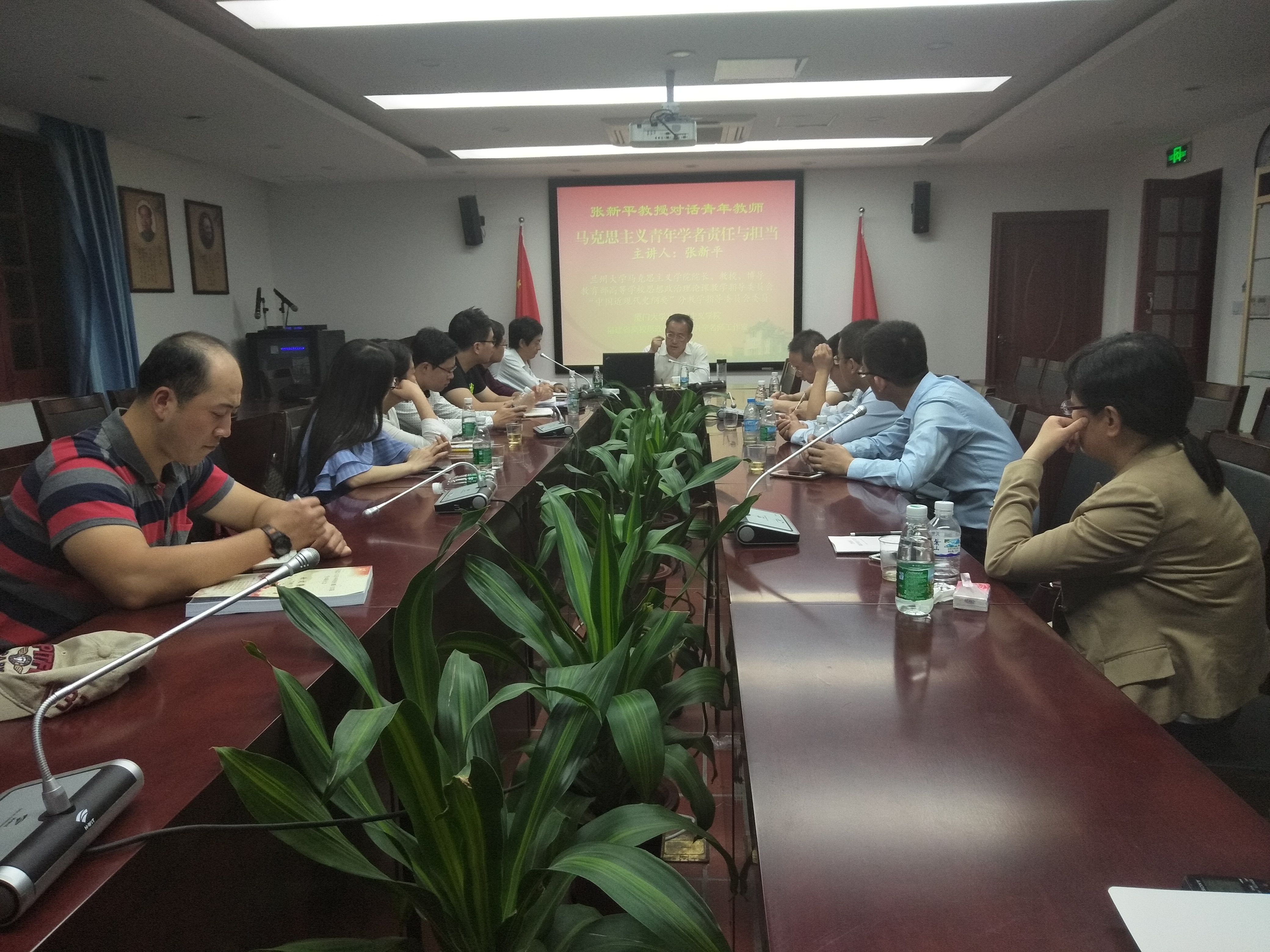 此次座谈会分为三个环节:第一个环节由张新平教授简单介绍了思政学科的历史演变过程、学科任务、以及发展过程中的不足之处。张教授认为思政学科发展的弱势之处就在于没有形成一支属于自己的队伍。他希望大家可以互相帮助、一起努力,争取建设一支强大的思政教学队伍。第二个环节由各个老师相互介绍自己,并提出自己在教学过程中遇到的问题及困难以及自己的一些想法。在最后一个环节中,张教授有感而发将自己多年的经验与想法分享给了各位青年教师。