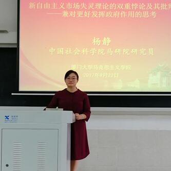 2017年9月22日早,在继续教育学院楼104,我院邀请中国社会科学院马克思主义研究院杨静研究员作了题为“新自由主义市场失灵理论的双重悖论及其批判——兼对更好发挥政府作用的思考”的学术讲座。此次讲座由张有奎副院长主持,罗礼太老师和我院部分17级研究生以及部分计算机专业17级研究生参加了此次讲座。
