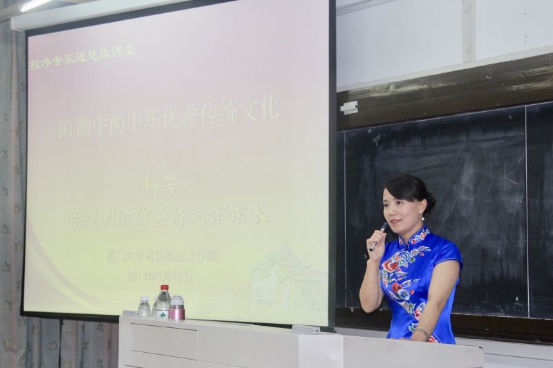 2017年5月18日下午2:30~4:10分在南强二(109)室由马克思主义学院组织的“校外专家进大学生思政课堂”系列知识讲座特邀福建连城明清牌匾陈列馆的杨芳馆长以"匾额中的中华优秀传统文化"为题为本科生开讲。本次讲座由马克思主义中国化教研部罗礼太老师主持。