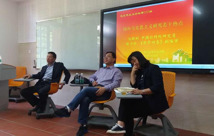 2017年4月28日上午9:30-11:45,中国社会科学院研究员冯颜利和《哲学动态》副编审强乃社做客我院,开展了一场题为“国外马克思主义研究若干热点”的讲座。讲座由宋建丽教授主持,我院石红梅副院长、杨胜良副教授、林密副教授、吴茜副教授、洪楼助理教授、李猛助理教授,以及学院全体马克思主义基本原理专业、国外马克思主义专业同学参加了此次讲座。
