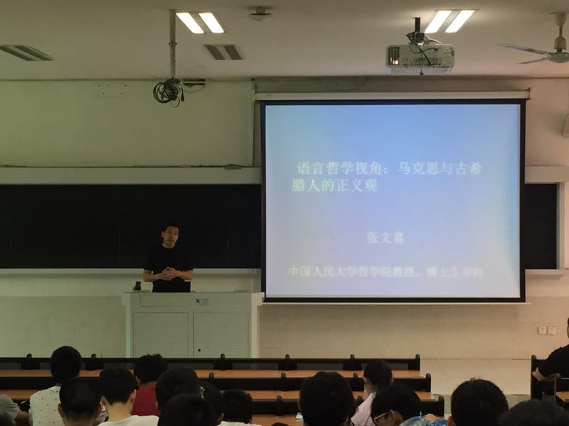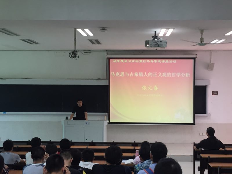 2017年4月24日上午,“马克思主义论坛暨校外专家进课堂”活动在学生公寓201教室举行。此次论坛邀请到了中国人民大学哲学院张文喜教授,讲座主题为“马克思与古希腊人的正义观的哲学分析”。本次讲座由吴文琦老师主持,八十余名本科生和硕士生共同参加。