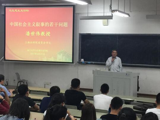 2017年4月21日,原上海社科院委员会书记、博士生导师、上海市委宣传部副部长潘世伟教授莅临我校。潘教授应邀,于21日第7、8节课,在海韵教学楼104为我校本科生带来一场以“中国社会主义叙事的若干问题”为题的精彩讲课。“专家进课堂”是我院一项特色教学设计,旨在提高我校教学质量和学生学业素质。