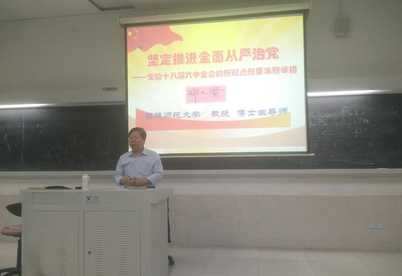 郑又贤教授的学术报告主要由五部分组成,主要内容为党的十八届六中全会的主题及其成果,党的十八大以来坚持“六抓”推进全面从严治党,《准则》提出的新的重大观点和举措,》条例》提出一系列新的要求和举措以及突出强调领导干部特别是高级干部的师范带头作用。郑老师还强调了党的十八届六中全会的召开是在全面小康社会的决胜阶段、“十三五”经济社会的开局之年以及中国共产党建党95周年后的再出发的特殊时机,应该坚持以问题为导向,坚持统筹协调,不断加强党内的民主政治生活。把纪律和规范挺在前面,从制度上规范党的各种行为,从严治党。