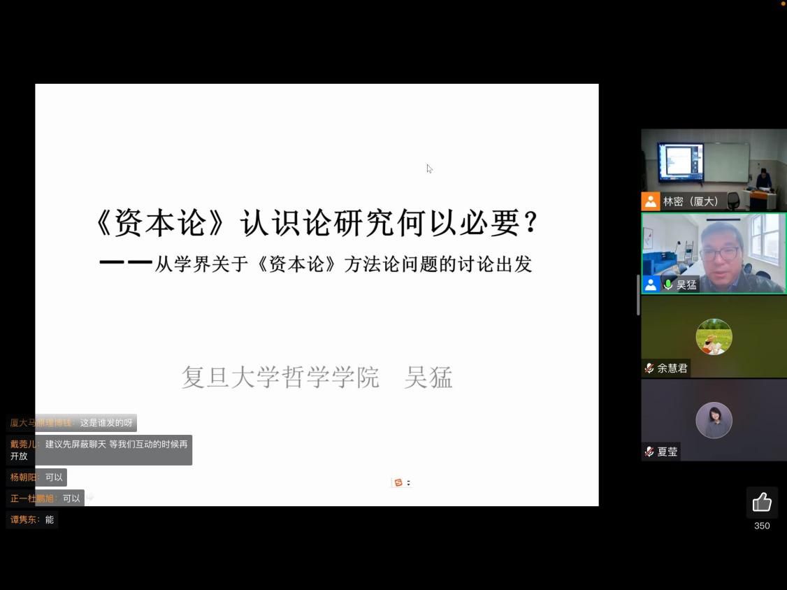 2022年4月8日晚,我院邀请到了复旦大学哲学系吴猛教授作了题为“《资本论》认识论研究何以必要?——从学界关于《资本论》方法论问题的讨论出发”的专题讲座。由于疫情原因,本次讲座采用线上会议的方式举行,由我院林密教授主持,部分老师和学生参加了本次讲座。