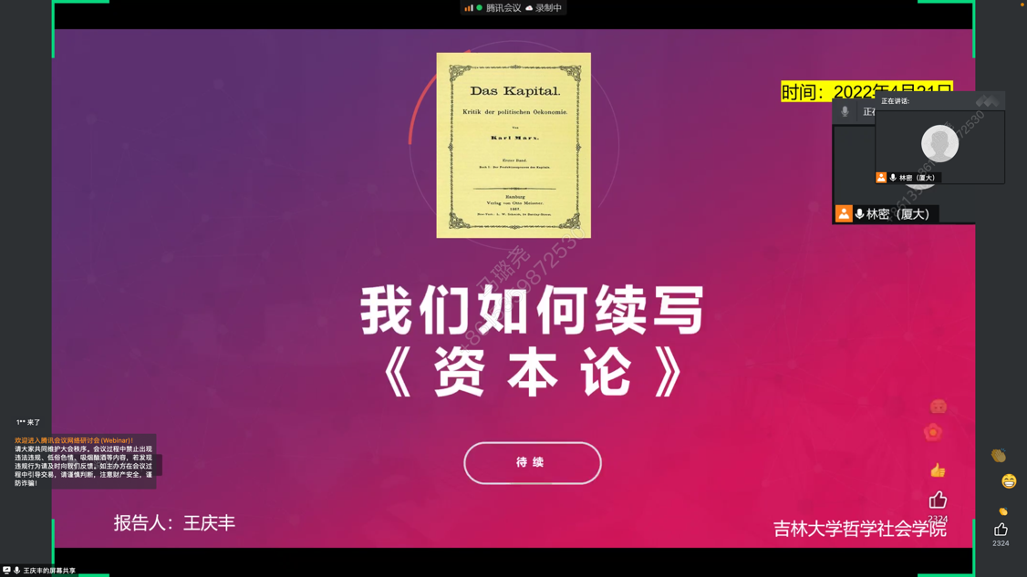2022年4月21日晚,我院邀请吉林大学哲学社会学院博士生导师王庆丰教授,作题为“我们如何续写《资本论》”的学术讲座。本次讲座由我院副院长张艳涛教授主持,采取线上会议方式,吸引了来自全国各高校百余名师生前来聆听。