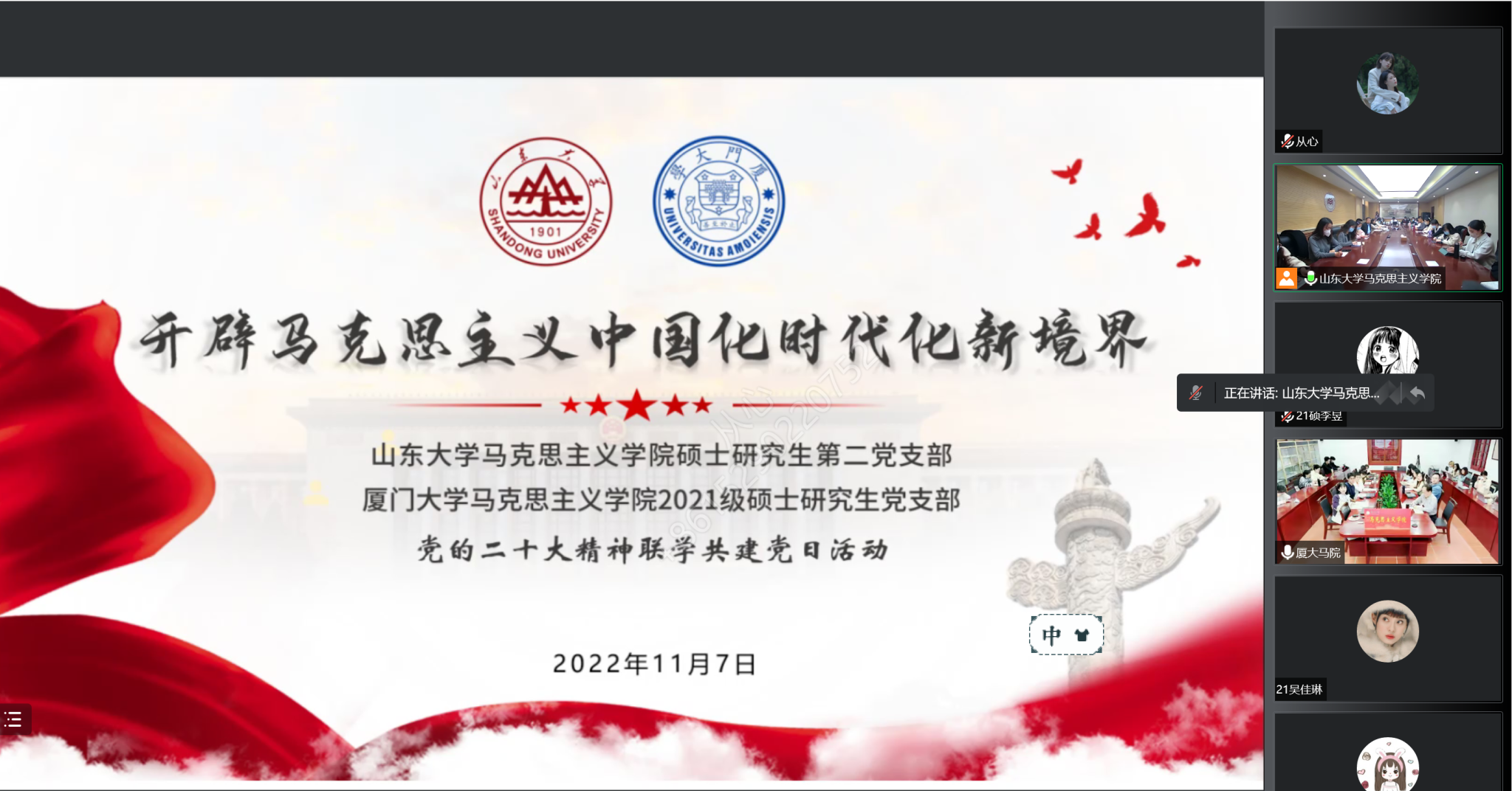 青春逢盛会,奋进正当时。为深入学习贯彻党的二十大精神,厦门大学马克思主义学院2021级硕士研究生党支部与山东大学马克思主义学院硕士研究生第二党支部联合发起以“开辟马克思主义中国化时代化新境界”为主题的党的二十大精神联学共建主题党日活动。