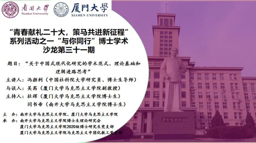 为深入学习贯彻党的二十大精神,2022年11月12日晚,厦门大学马克思主义学院2020级博士研究生党支部、厦门大学马克思主义中国化教工党支部和南开大学马克思主义学院博士生理论研究会相聚云端,共同举办“青春献礼二十大,策马共进新征程”系列活动、“与你同行”博士学术沙龙第三十一期。