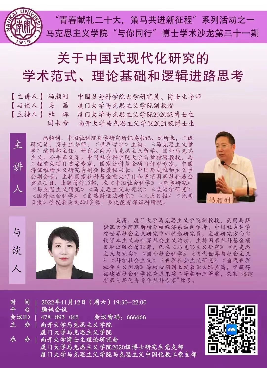 本期学术沙龙邀请中国社会科学院哲学研究所纪委书记、副所长冯颜利研究员作了题为《关于中国式现代化研究的学术范式、理论基础和逻辑进路思考》的学术讲座。本次沙龙活动由厦门大学马克思主义学院吴茜副教授作为与谈人,厦门大学马克思主义学院2020级博士研究生杜辉和南开大学马克思主义学院2021级博士研究生闫书帝共同主持,累计来自全国20多所高校180余名师生参会。