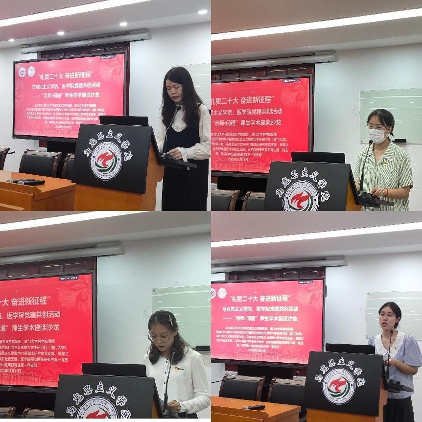 11月13日下午,马克思主义学院、医学院党建共创活动——“亲师·问道”师生学术座谈沙龙于囊萤楼313报告厅成功举办。厦门大学医学院党委副书记辛晓丹、团委书记乐无恙、研究生辅导员谢彦贞;厦门大学马克思主义学院党委副书记杨建中、副教授王亚群、团委书记郭晓玲出席活动。双方共80余人参与其中,活动由马克思主义学院2022级硕士研究生郑婧妍主持。