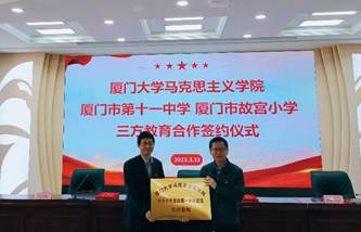 2023年3月13日下午,为推进思政课一体化建设,探讨中小学和高校思政课共建模式,厦门大学马克思主义学院思想政治教育教工党支部、福建省厦门市第十一中学、故宫小学三方本着优势互补、共同发展的原则,在厦门市第十一中学校区举办三方教育合作与党建结对共建签约仪式,共建大中小学思政课一体化建设实训基地。厦门大学马克思主义学院党委书记石红梅,常务副院长张有奎,思政教工党支部书记苗瑞丹、支部委员王圣宠、池骋,学院学生代表以及厦门市第十一中学、故宫小学部分师生代表参加此次合作共建活动。活动由厦门市第十一中学教师景伟哲主持。