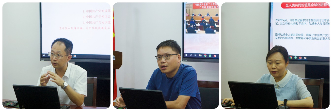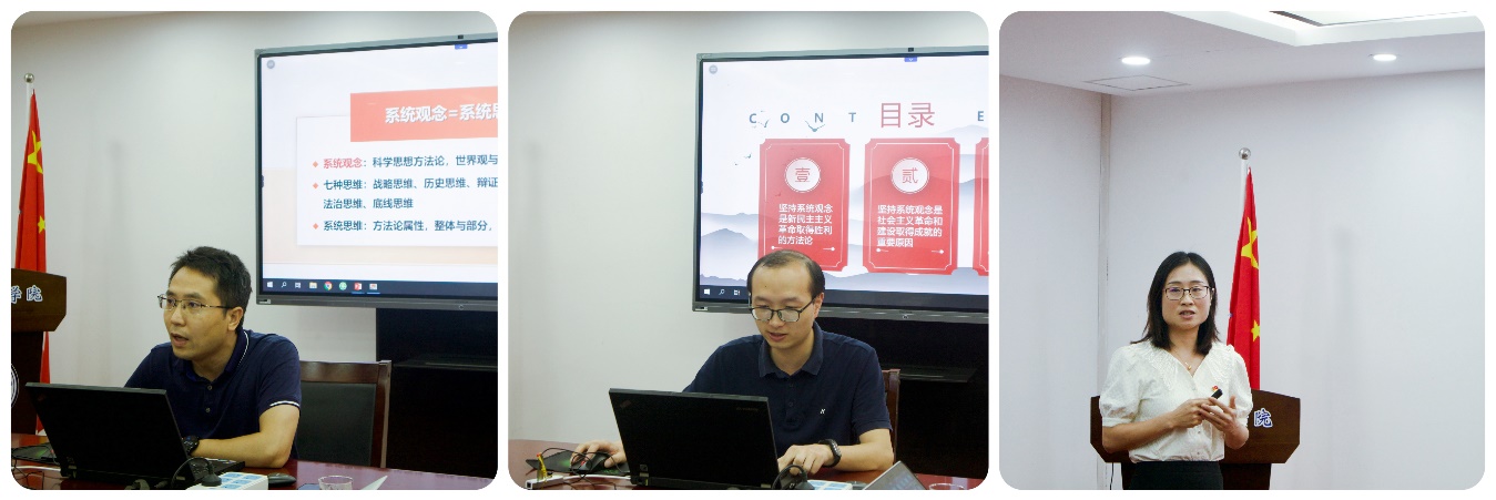 林密、史勤、庄三红三位老师分别围绕“坚持系统观念”的理论、历史、实践三重逻辑展开阐述。张艳涛、佳宏伟、苗瑞丹三位老师分别围绕“坚持胸怀天下”的理论、历史、实践三重逻辑展开阐述。