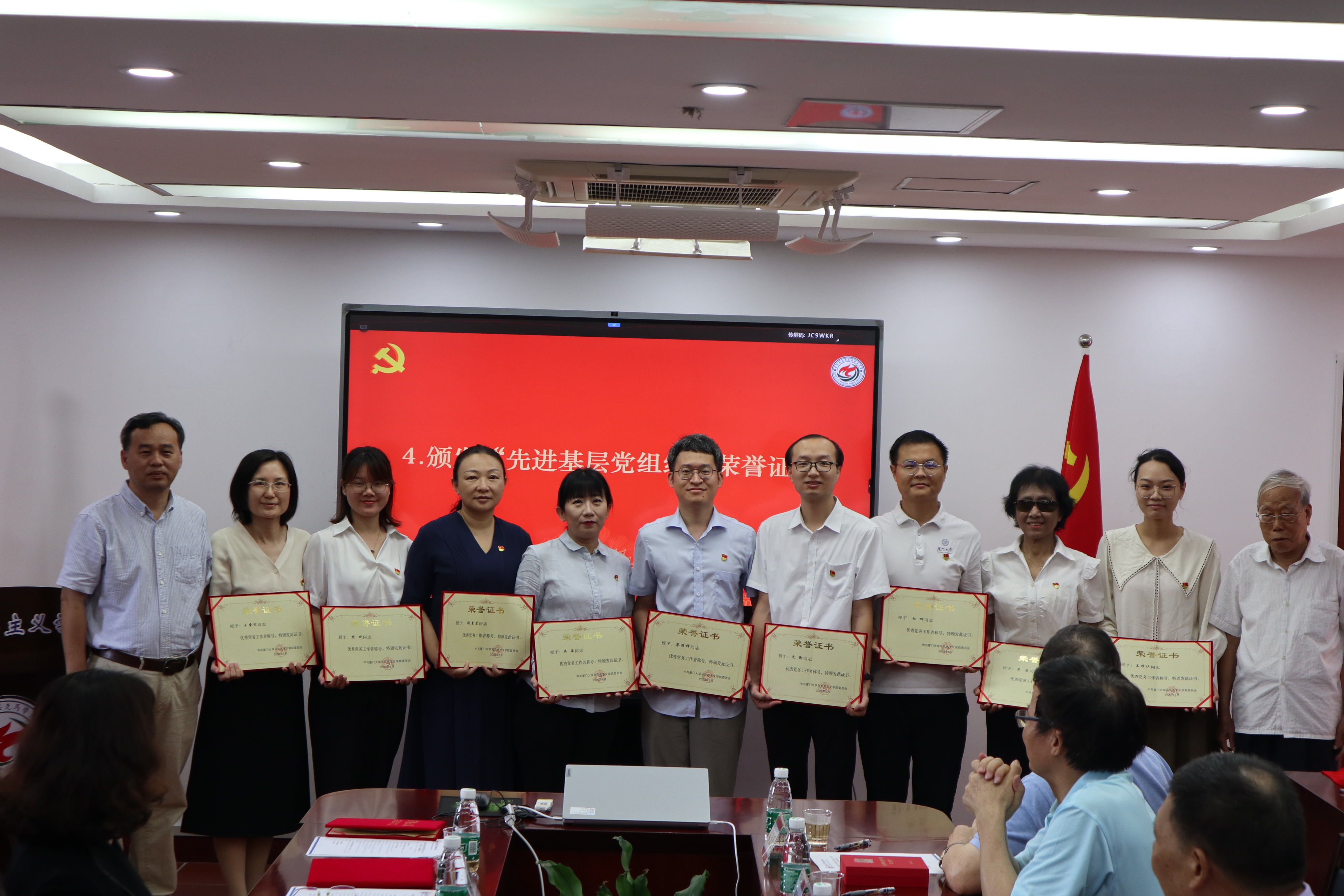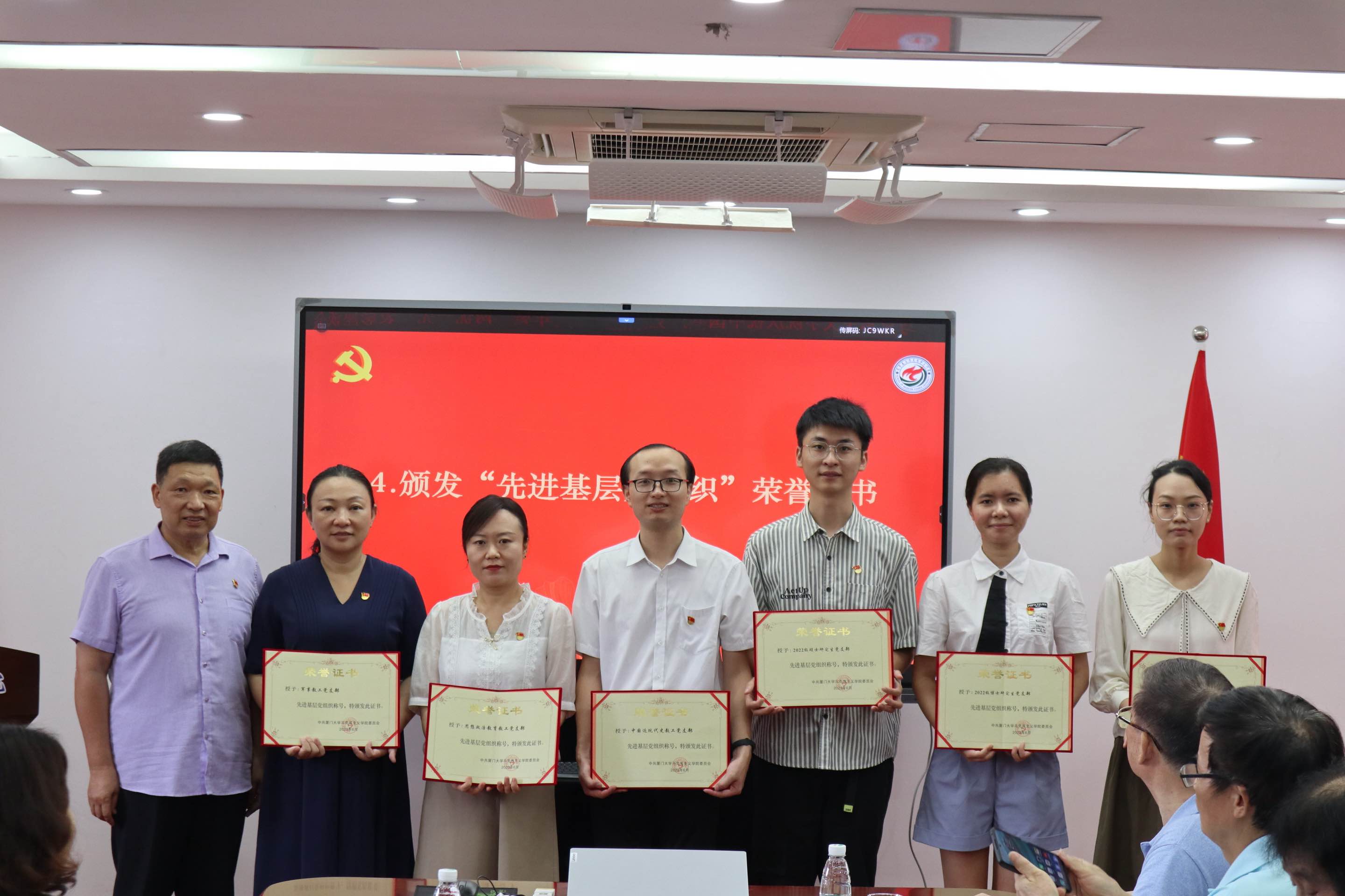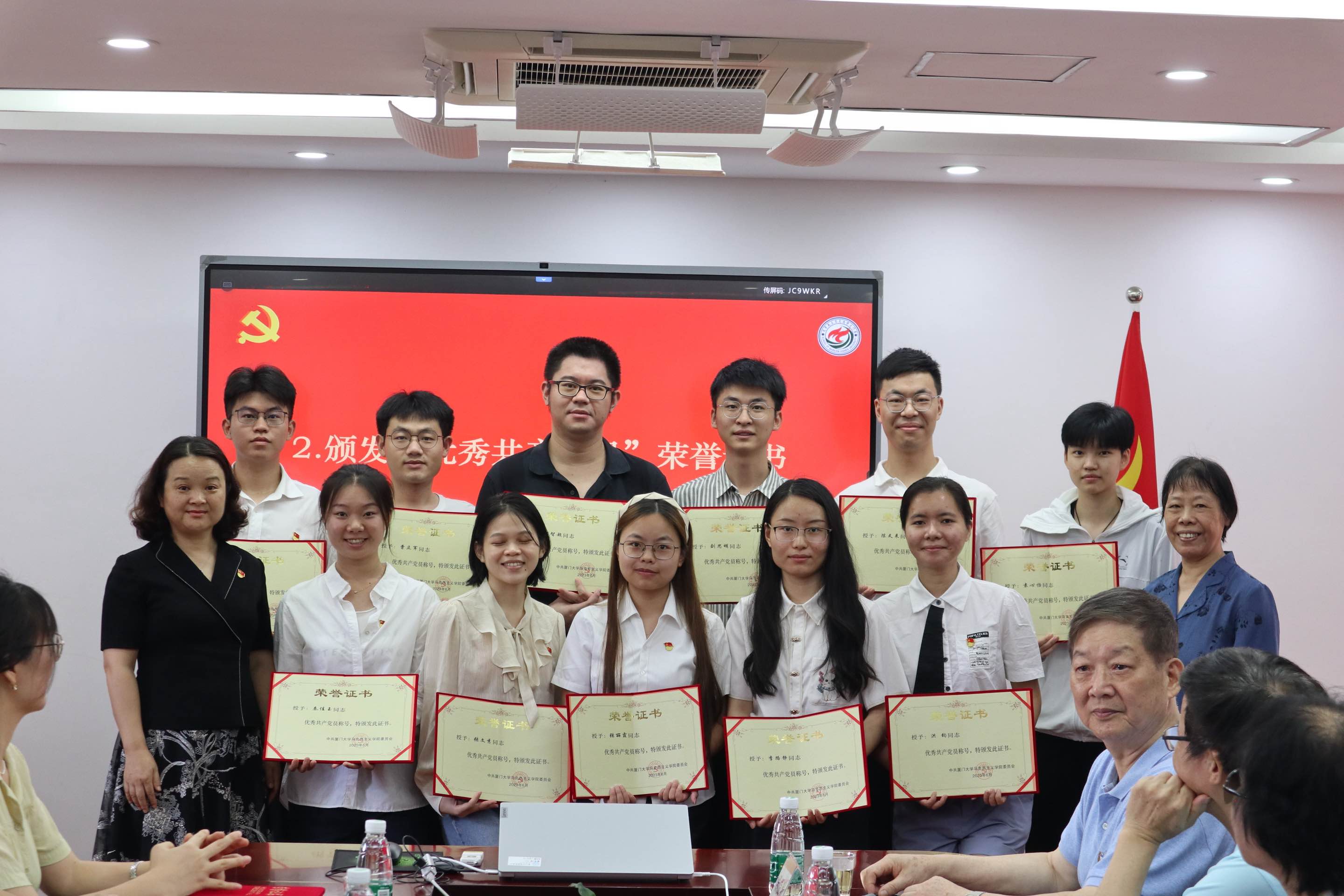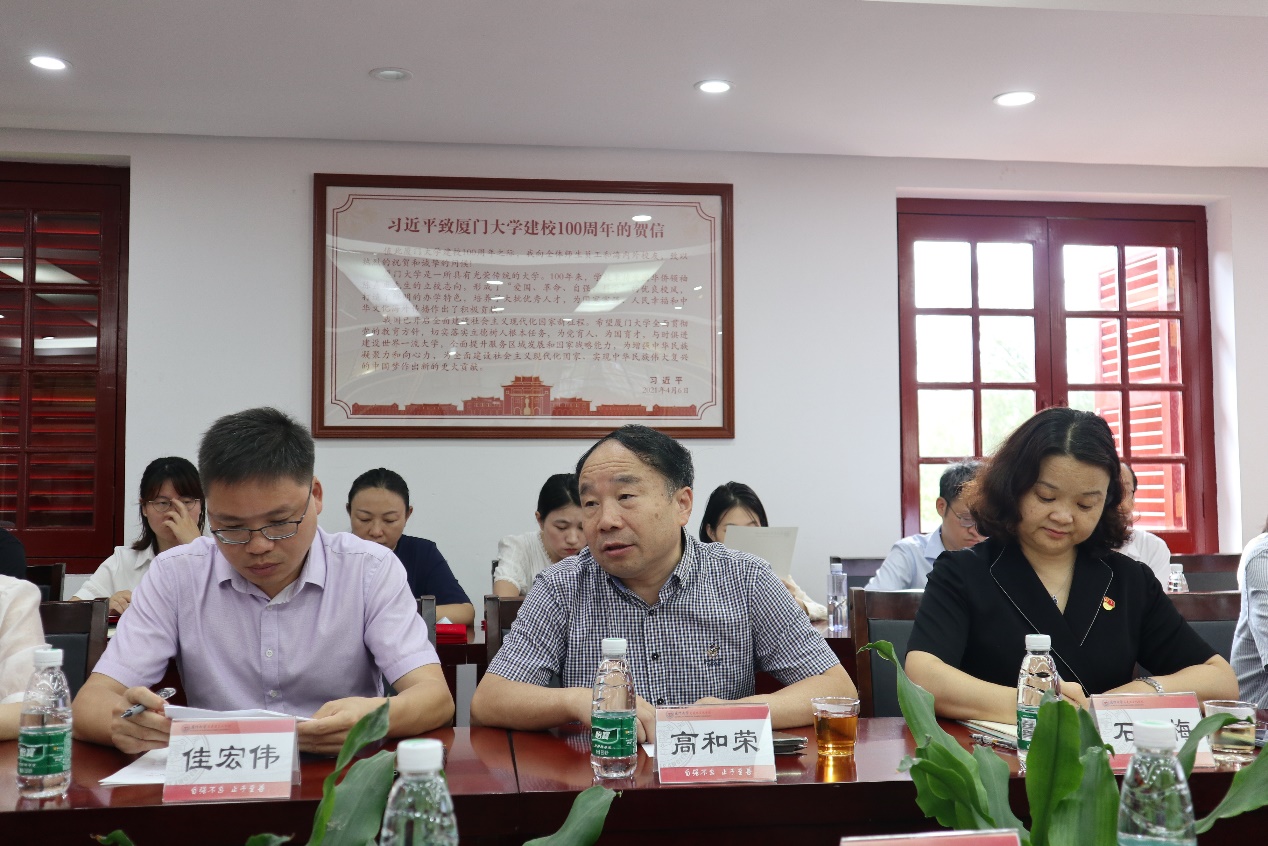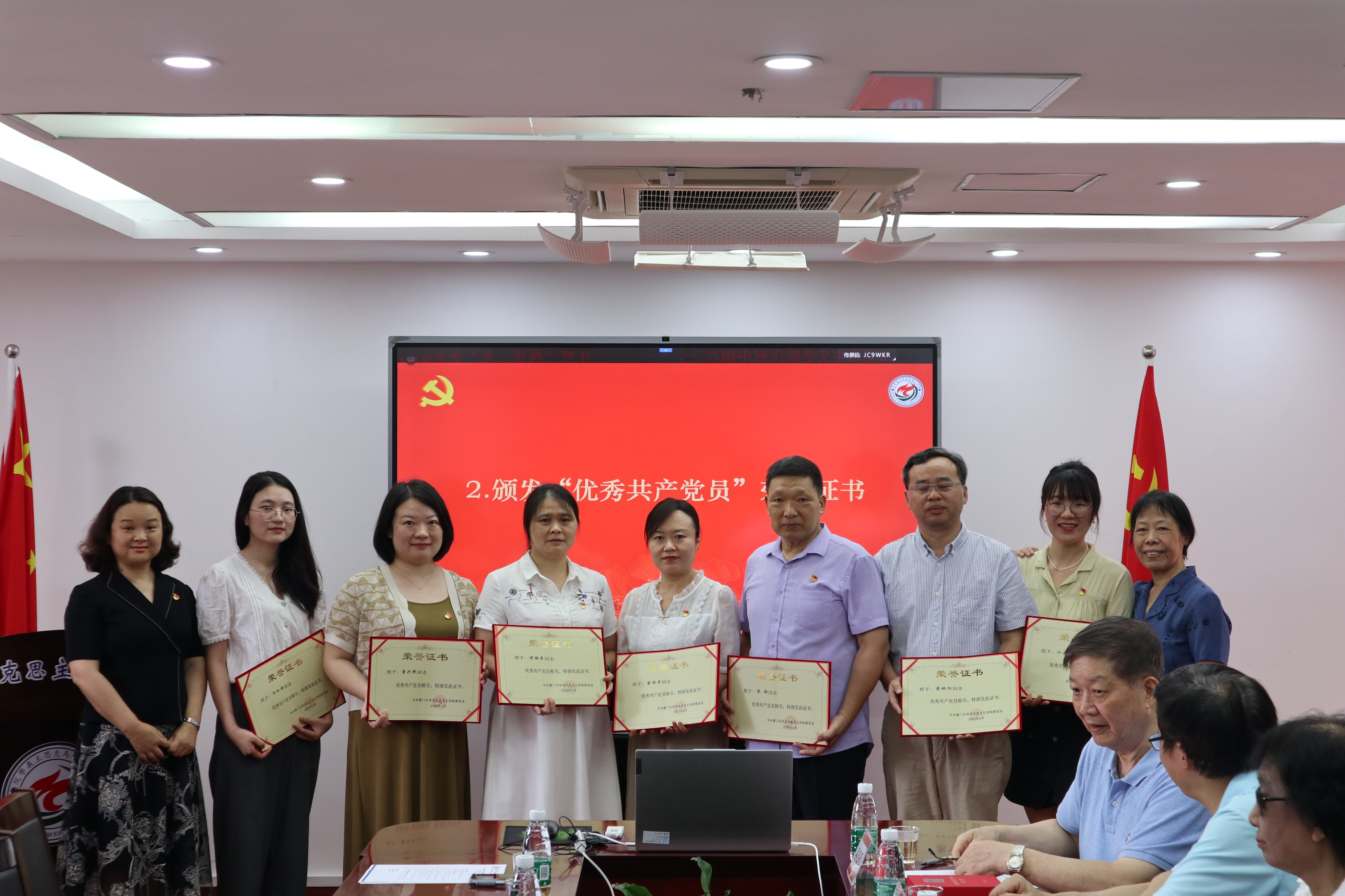 为庆祝中国共产党成立102周年, 2023年6月30日上午,马克思主义学院在囊萤楼302会议室召开庆祝中国共产党成立102周年暨“两优一先”表彰会。马克思主义学院退休老党员代表欧阳佑民、苏劲、吴温暖、何其颖、吴凌、陈宣明、李智贞,学院党委书记石红梅,学院党委委员、“两优一先”表彰对象、青年教师党员代表和新发展党员代表参加会议。本次会议由党委委员佳宏伟副教授主持。厦门大学党委宣传部/教师工作部部长、社科处处长高和荣教授受邀出席会议。
