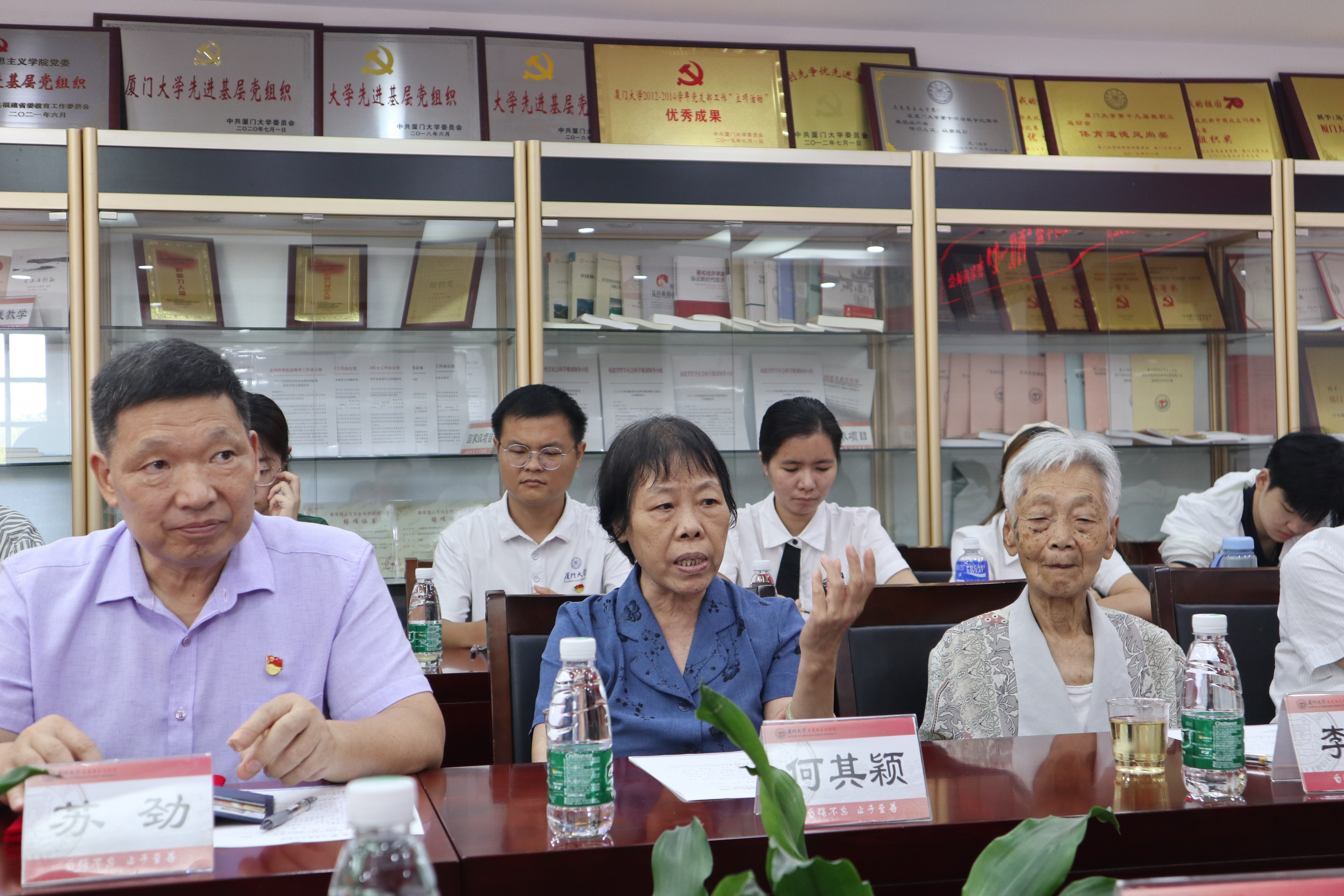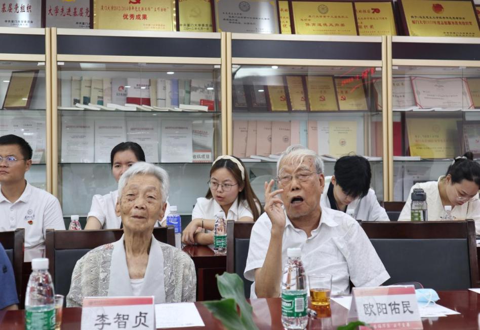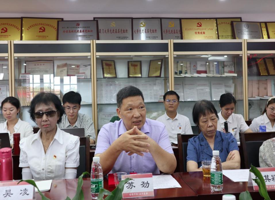 党课结束后,与会师生党员畅谈交流。苏劲回忆起在厦门大学读书时光荣加入中国共产党的情景,他勉励在座的青年党员,在工作和学习中不免会遇到困难和挫折,但只要不忘初心,将个人理想和国家命运紧密联系在一起,就能拥有战胜困难的勇气和力量。吴温暖谈到他入党后的心路历程。他是1973年在部队当兵时加入中国共产党,多年的军旅生涯熏陶着他不竭的爱国情怀,转业来厦后,他也始终坚守“祖国利益高于一切”的初心。欧阳佑民感慨,今天恰好是他的政治生日,他于1960年6月30日加入中国共产党,如今正好是入党第63年。他回顾了建院历史,饱含深情鼓励大家要有自信做学问,要带有希望做科研,推进我们的事业不断焕发出蓬勃生机与活力。