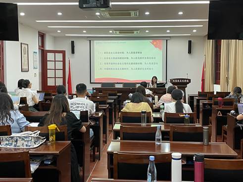为更好地学深悟透习近平新时代中国特色社会主义思想,促进党员干部的思想认识和理论水平的提高,7月5日晚在囊萤楼216会议室,马克思主义学院2021级硕士研究生党支部邀请学院副院长原宗丽教授讲授主题党课。