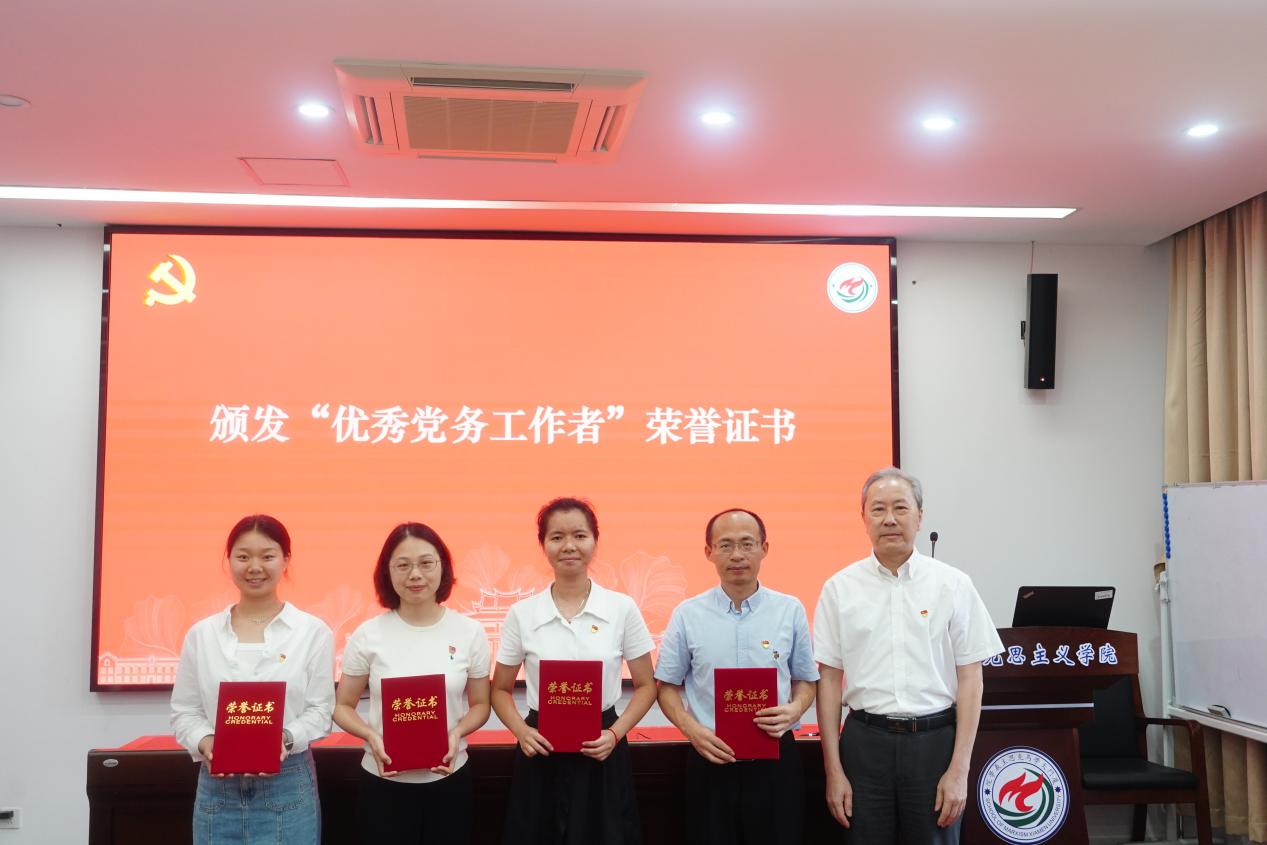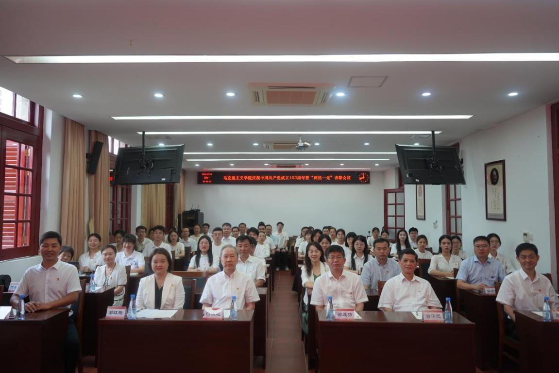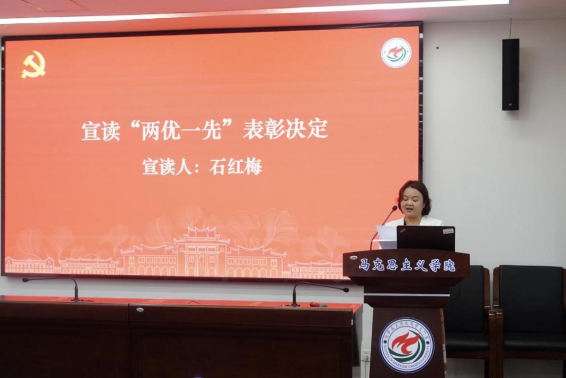 为庆祝中国共产党成立103周年,2024年7月1日上午,马克思主义学院在囊萤楼216会议室召开庆祝中国共产党成立103周年暨“两优一先”表彰大会。校党委原副书记、马克思主义学院院长徐进功,学院党委书记石红梅,党委副书记、常务副院长张有奎,副院长原宗丽出席会议。