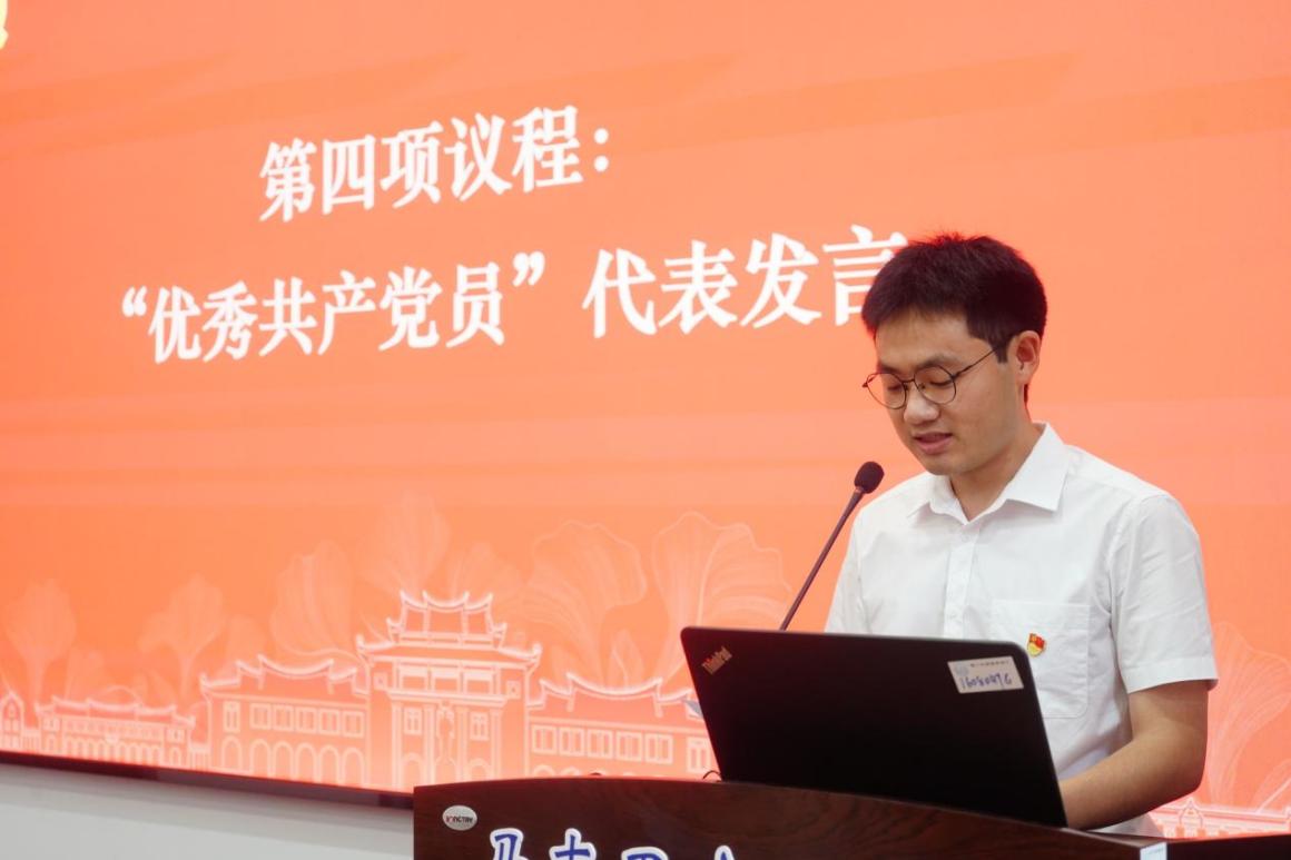 优秀共产党员代表曹立军、优秀党务工作者代表佳宏伟依次上台发言。他们回顾入党初心,讲述工作中的难忘经历,分享了支部建设、个人成长等方面的经历和体会。