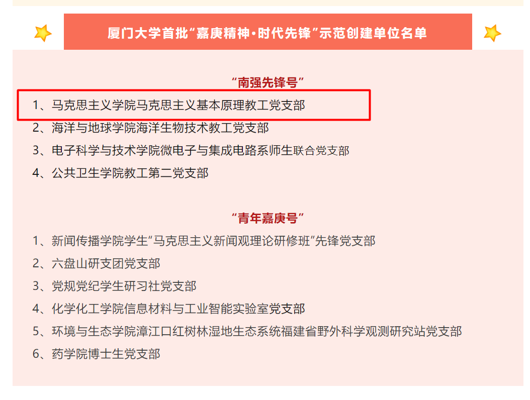 近日,学校公布了厦门大学首批“嘉庚精神·时代先锋”示范创建单位名单,我院马克思主义基本原理教工党支部成功入选“南强先锋号”示范创建单位。