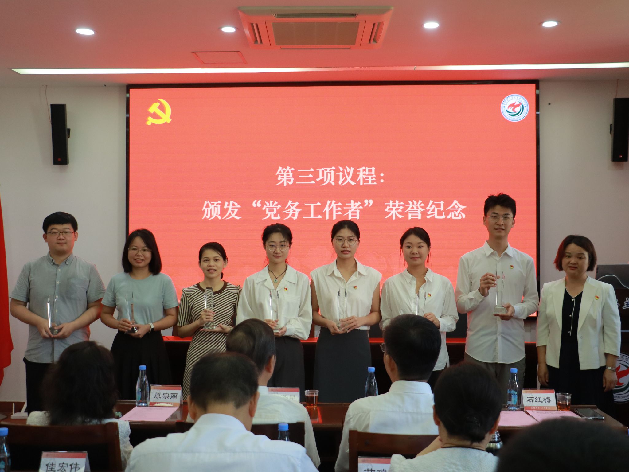 在表彰“两优一先”之后,大会特别为即将毕业离校、在支部党建工作中辛勤付出的9名毕业生党支部书记和委员颁发“党务工作者”荣誉纪念,感谢他们为学院基层党建工作做出的贡献。石红梅为获得表彰的代表颁发荣誉纪念。