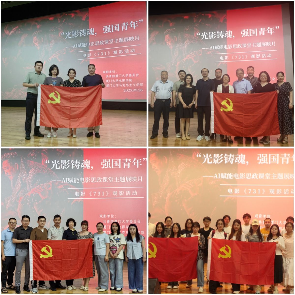 为纪念中国人民抗日战争暨世界反法西斯战争胜利80周年,引导师生党员坚定理想信念,传承红色基因,厚植家国情怀,9月28日晚,厦门大学马克思主义学院党委与校团委、电影学院党委联合举办《731》集中观影活动,共200余名师生党员参加。活动在厦门大学思明校区科艺中心电影院举行。