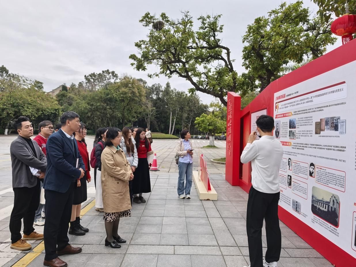 会后,与会师生移步科学艺术中心广场,共同学习“厦门大学纪念福建省第一个党组织中共厦门大学支部成立100周年”主题展板内容,回望厦大波澜壮阔的革命足迹,重温学校光荣的革命传统。2025级硕士研究生第一党支部书记、厦门大学革命史展览馆志愿讲解员张铭现场为大家做精彩讲解。展板前,大家不时驻足凝视、交流感悟,从罗扬才、杨世宁等革命先辈的英勇事迹中汲取奋进力量。师生们纷纷表示,作为新时代的厦大马院人,要自觉传承红色基因,赓续共产党人精神血脉,将革命先烈的崇高精神转化为干事创业的强大动力,以更加昂扬的姿态投身于党建工作和教学科研之中。