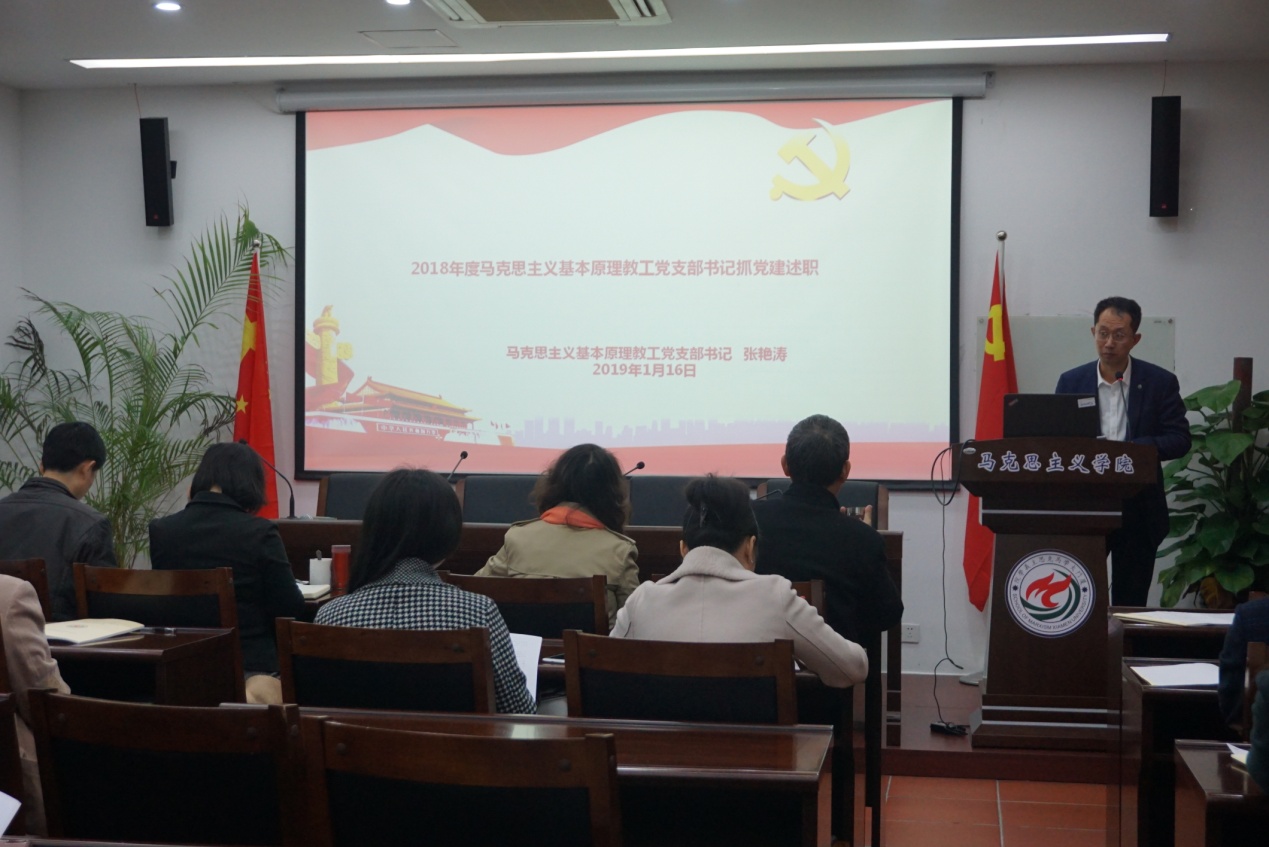 马克思主义基本原理教工党支部书记张艳涛从“两学一做”常态化制度化、学习宣传十九大精神和习近平新时代中国特色社会主义思想、带领支部成员积极发出“马原之声”、将十九大精神融入教材及社会实践调研活动、积极走出校门进行理论宣讲等五个方面讲述了支部一年来积极开展的活动及其成效,并深刻分析了支部存在的问题与不足,并提出了改进方向与未来工作思路。马克思主义基本原理教工党支部在2018年获评为“全国党建样板支部”“厦门大学先进基层党组织”,并获得2016-2018学年福建省高校党支部工作立项活动“省级优秀成果一等奖”,党建工作扎实、特色鲜明,为我院其他党支部建设提供了样板和示范。