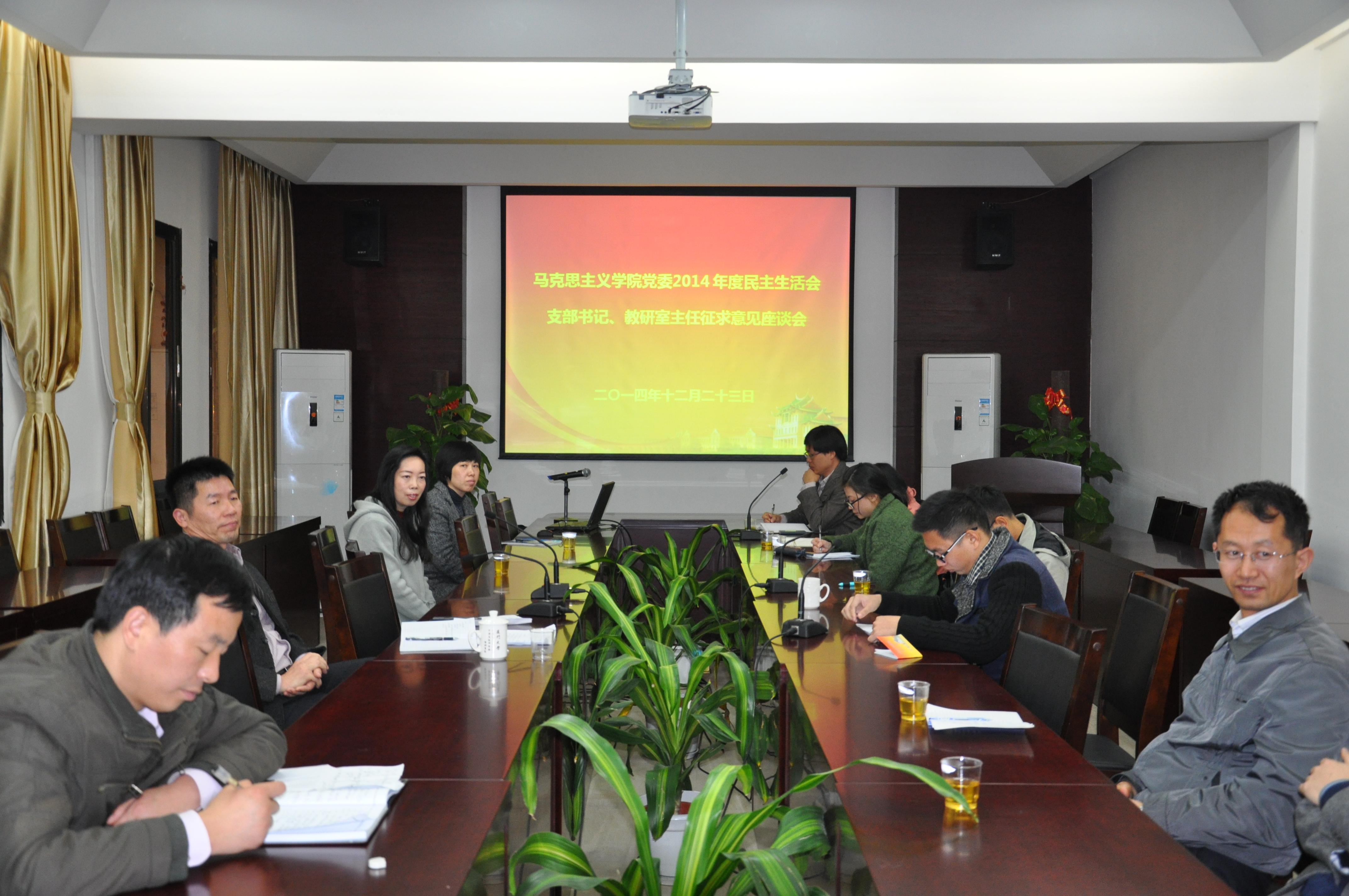 12月23日下午四点,我院在成智二110会议室召开了2014年度民主生活会支部书记、教研室主任征求意见座谈会。各支部书记及各教研室主任、副主任参加了此次会议。会议由许和山书记主持。