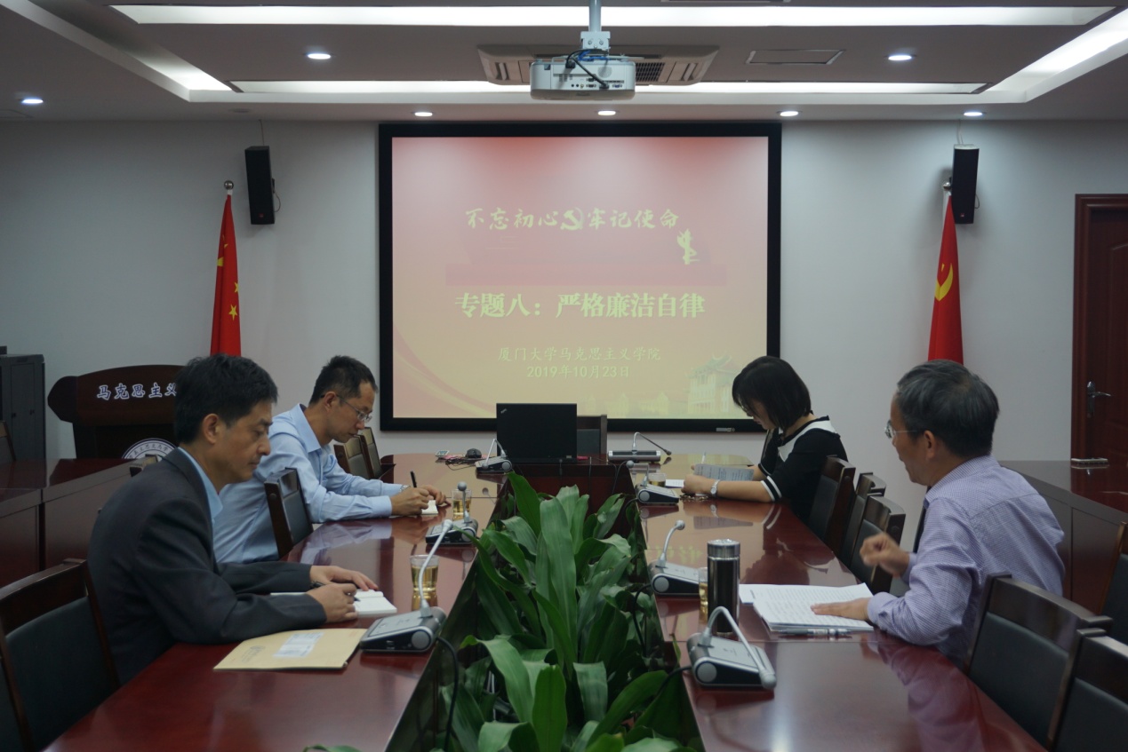 2019年10月23日晚,我院党委在囊萤楼302会议室开展“不忘初心、牢记使命”主题教育第八专题集中学习,学习围绕专题“严格廉洁自律”展开,院党委书记侯利标,常务副院长、党委副书记张有奎,副院长张艳涛参加此次学习。