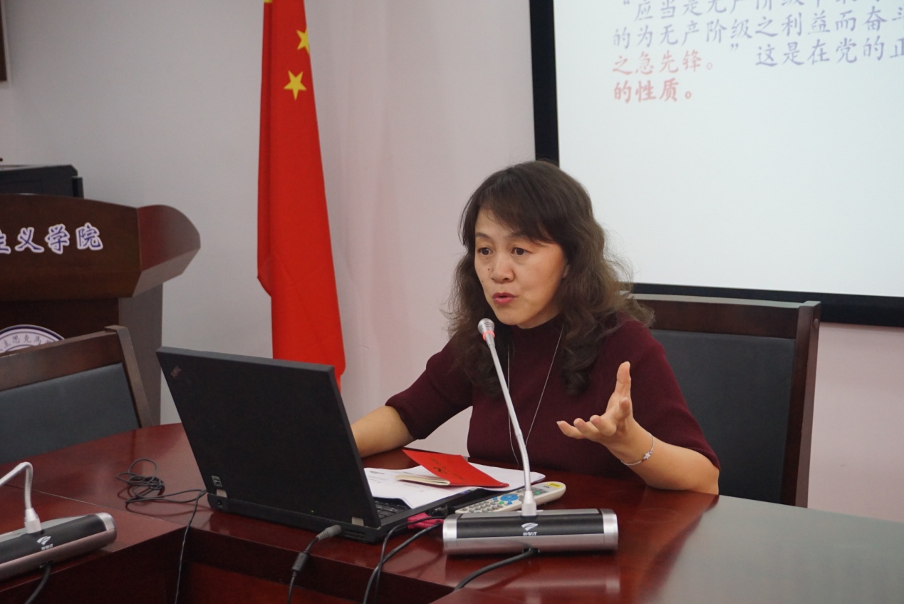 原宗丽副书记作主题发言。原老师主要从深刻把握党的性质和始终牢记党的宗旨两方面做交流汇报。首先从历史沿革、表述特点、理论基石三方面详细论述了党的性质,指出核心在于保持党的先进性,另外也介绍了新征程下管党治党的重点工作。随后原老师指出要始终牢记党的宗旨,中国共产党人要树立正确的群众观。从多方面深刻论证了人民群众主体地位的重要性,指出要把握好党的群众路线的核心要义。最后原老师总结中国共产党人要不断为中国人民谋幸福、为中华民族谋复兴。这是中国共产党人的初心与使命,也是前进的根本动力。中国共产党人要真正做到不忘初衷、不忘来路、不忘本质、不丢使命、不失精神、不停脚步。
