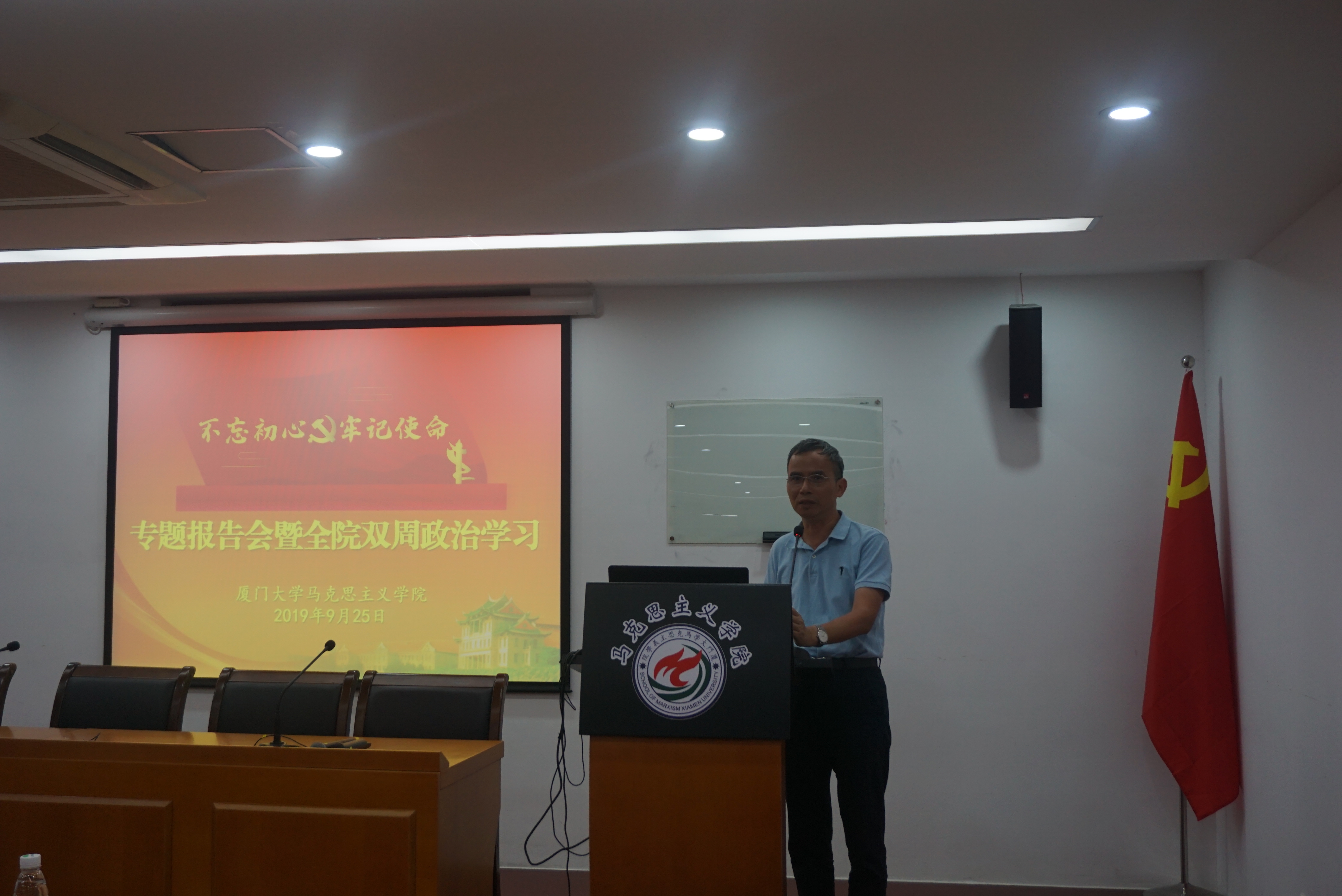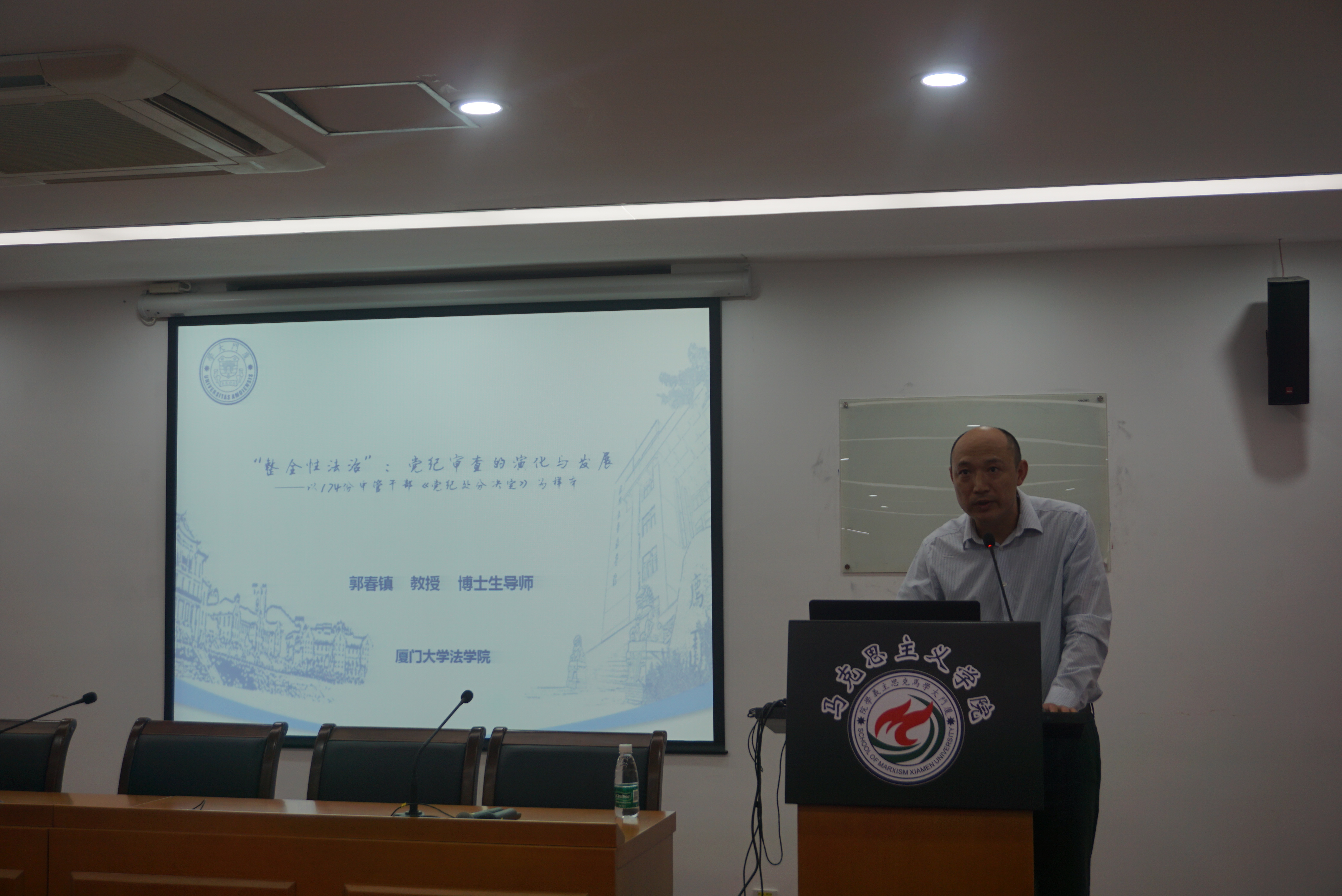 当天下午,马克思主义学院在囊萤楼313报告厅召开“不忘初心、牢记使命”主题教育专题报告暨全院双周政治学习活动,邀请厦门大学法学院副院长、博士生导师郭春镇教授作了题为《“整全性法治”:党纪审查的演化与发展》的讲座。学院领导班子成员,全院教职工、研究生党支部支委参加了本次学习活动。报告会由侯利标书记主持。