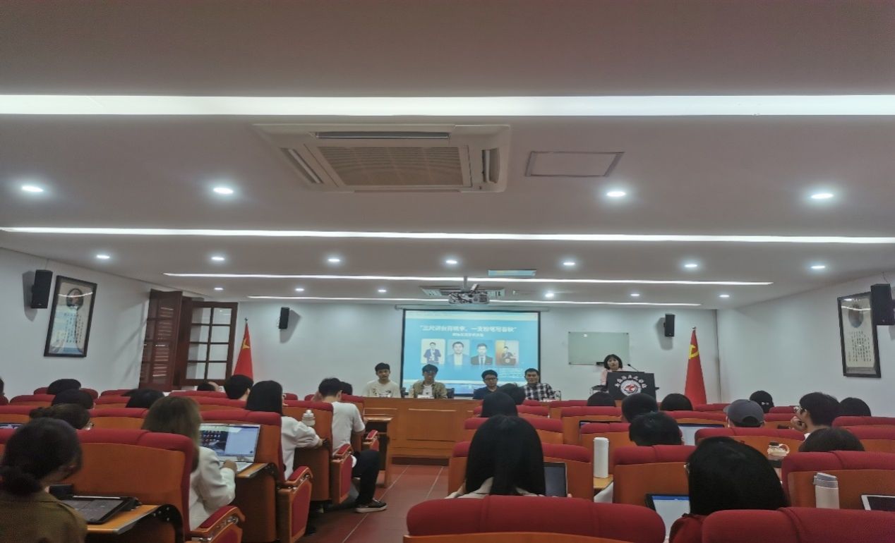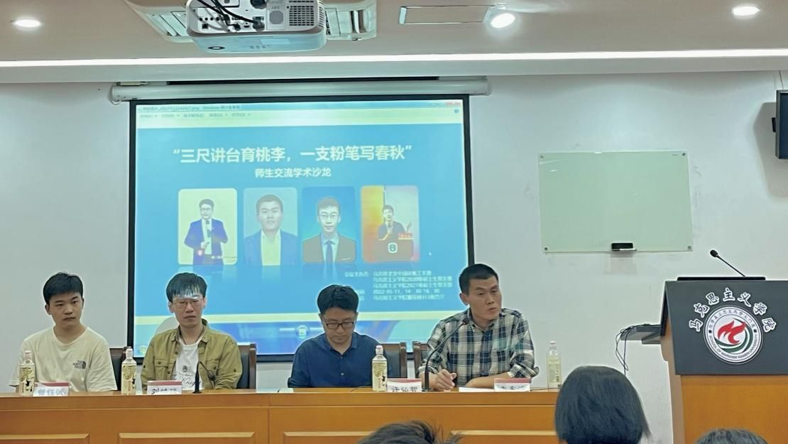 5月11日下午,马克思主义中国化教工支部联合马克思主义学院2020级、2021级硕士研究生支部在囊萤楼313报告厅举行“三尺讲台育桃李,一支粉笔写春秋”师生交流学术沙龙活动。马克思主义学院青年教师刘皓琰、朱东波、许弘智和曾钰诚老师作为应邀嘉宾,与同学们畅谈个人科研经历和科研体悟。本次活动由马克思主义中国化教工支部书记吴茜副教授主持。