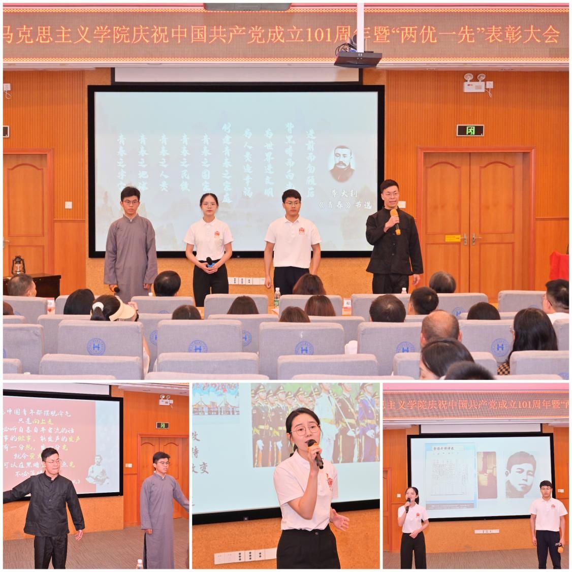 、为庆祝中国共产党成立101周年,迎接党的二十大胜利召开,2022年7月1日上午,马克思主义学院在化学报告厅召开庆祝中国共产党成立101周年暨“两优一先”表彰大会。校党委副书记、马克思主义学院院长徐进功出席大会。校关工委副主任苏劲、马克思主义学院退休教师何其颖,学院党委书记石红梅,党委副书记、常务副院长张有奎,副院长张艳涛,以及全院师生党员、入党积极分子参加了本次大会。大会由学院党委副书记杨建中主持。
