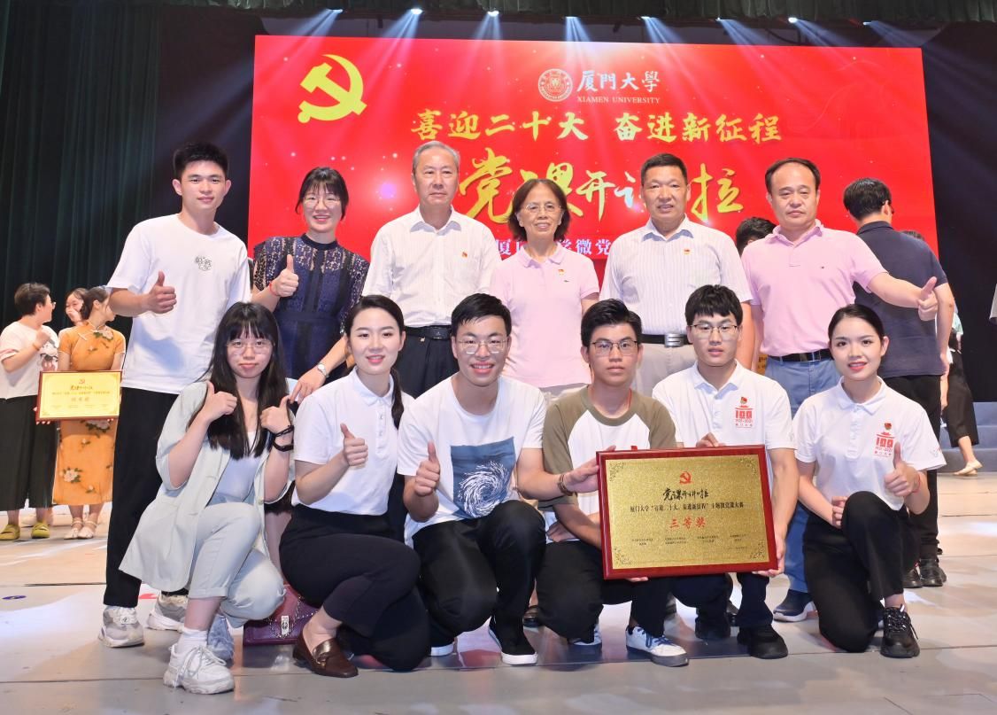 喜迎党的二十大,奋进新时代新征程。7月8日晚,厦门大学“党课开讲啦”微党课大赛决赛在建南大会堂举行。我院2020级硕士研究生党支部和2021级硕士研究生党支部的9名同学组成的微党课团队,代表马克思主义学院党委参加本次决赛。经过激烈角逐,我院同学在本次微党课比赛中荣获三等奖的好成绩。他们以《我愿意,我看见》为题,通过故事讲述、情景剧表演、音乐党课、主题演讲等多种形式将厦大青年不畏艰难险阻、勇担历史使命的百年初心生动地呈现在大家面前。