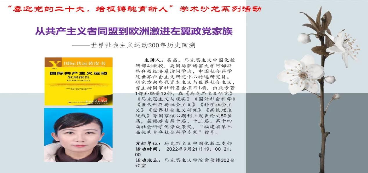为进一步提振精神、凝聚力量,激励和动员全体党员更加紧密地团结在以习近平同志为核心的党中央周围,热烈迎接党的二十大胜利召开,2022年9月24日,厦门大学马克思主义学院马克思主义中国化教工党支部联合举办的“喜迎党的二十大 培根铸魂育新人”沙龙活动开讲。中国化教工支部与2021级硕士生党支部党员参加活动。
