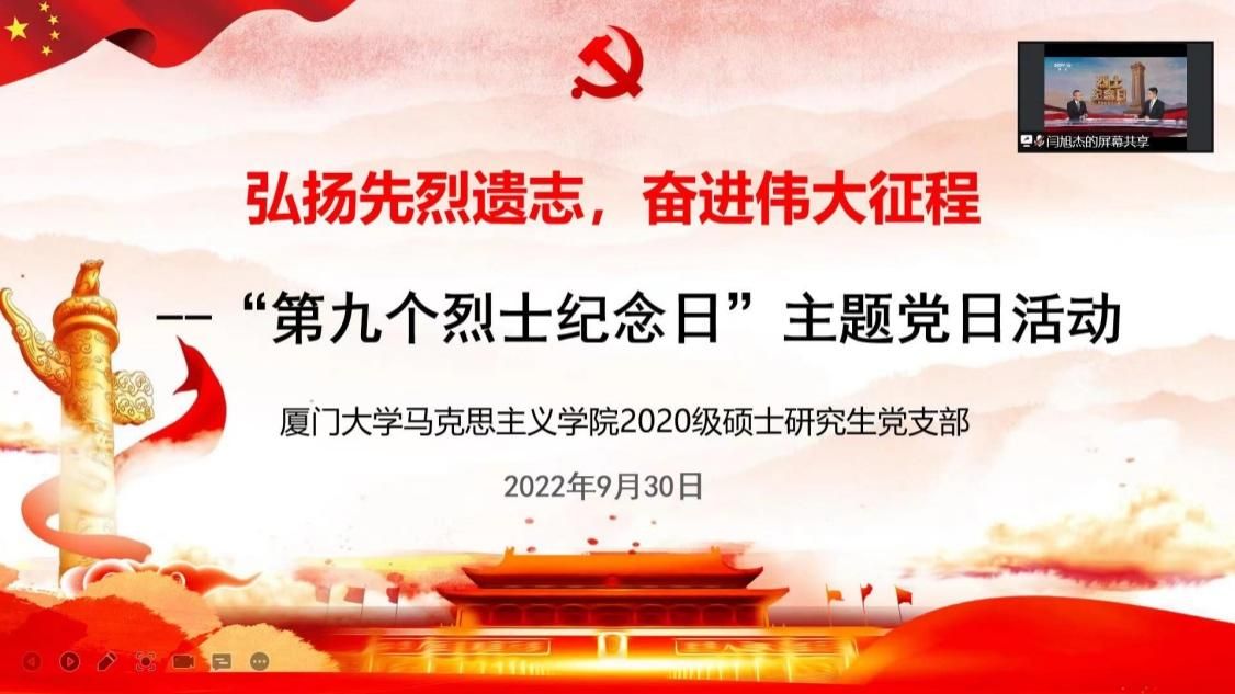 2022年9月30日是中国第九个烈士纪念日,为缅怀革命先烈、传承红色基因,2020级硕士研究生党支部以线上方式举行“继承先烈遗志,奋进伟大征程”主题党日活动。