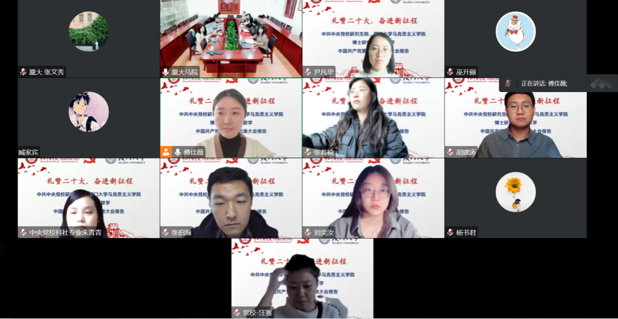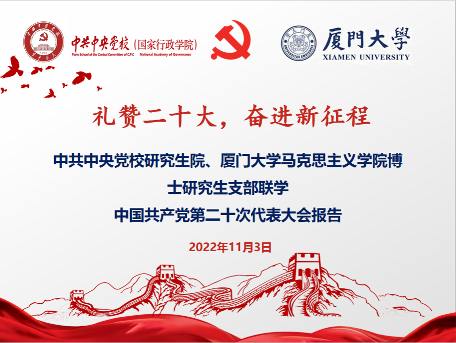 为进一步学习研究贯彻党的二十大精神,加强高校研究生之间的理论研学交流,11月3日下午,厦门大学马克思主义学院2021级博士研究生党支部与中共中央党校(国家行政学院)研究生院2021级博士研究生第四支部发起“礼赞二十大 奋进新征程”线上联学活动,共同学习党的二十大精神。活动由郭晓玲(厦门大学)、傅佳薇(中央党校)共同主持。