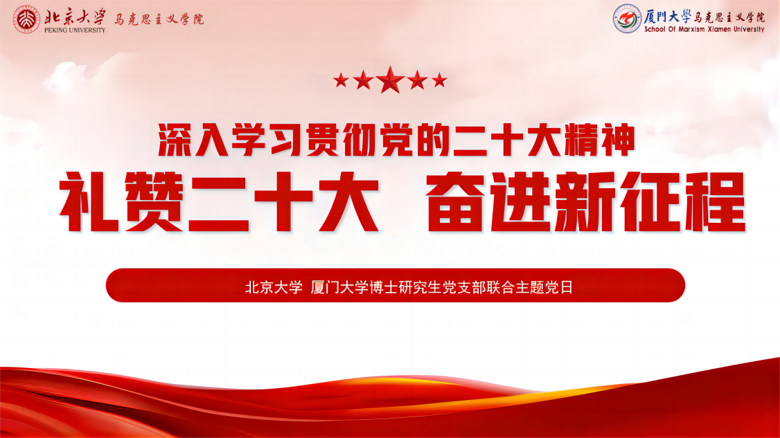 为深入学习贯彻党的二十大精神,坚定理想信念,凝聚青年力量,厦门大学马克思主义学院2020级、2021级博士生党支部与北京大学马克思主义学院2020级博士生1班党支部,联合举办“礼赞二十大,奋进新征程”主题党日活动。