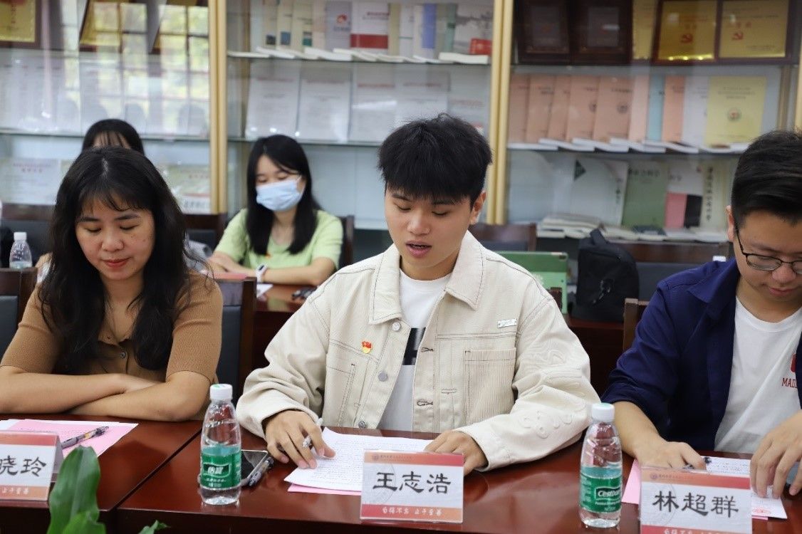 学院2021级博士研究生陈溢从“坚定理论自信“”掌握科学方法“”见诸实际行动“三个方面分享了他对学习二十大精神的态度和方法。他在发言中谈到,对于马克思主义,不仅要知其然,还要知其所以然,更要知其所必然,要不断加深对二十大精神的学习并始终如一地践行。 学院2021级硕士研究生王志浩聚焦”三个务必“,分享他对二十大精神的心得和体会。他认为,新时代青年生逢其时,责任在肩,务必要以”三个务必“警醒自己不忘初心、鼓足韧劲、专心致志,立志做一个有理想、敢担当、能吃苦、肯奋斗的新时代青年。
