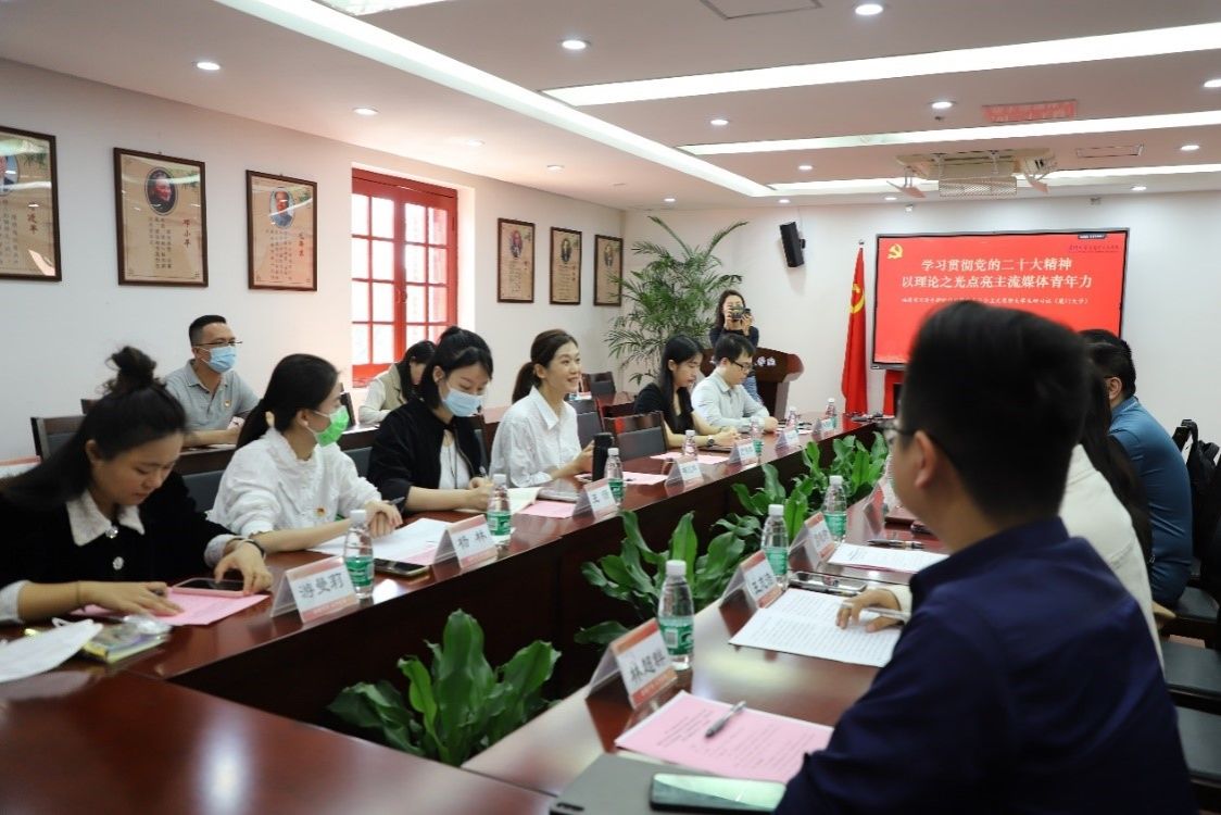 11月10日上午,深入学习贯彻党的二十大精神系列活动之“以理论之光点亮主流媒体青年力”活动在囊萤楼302会议室举办。本次活动由福建省习近平新时代中国特色社会主义思想大学生研习社(厦门大学)和厦门广电集团青年学习小组联合举办。厦门大学马克思主义学院党委书记石红梅教授、肖斌副教授、团委书记郭晓玲出席活动。双方成员共20余人参加活动。活动由厦门广电集团林懿琳主持。