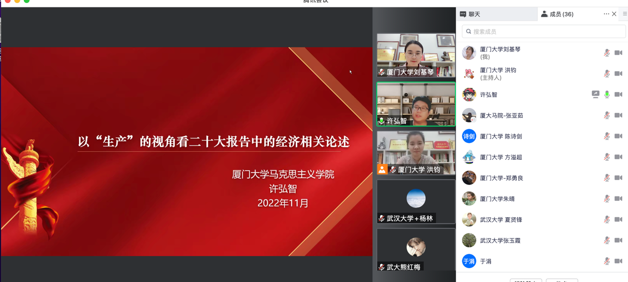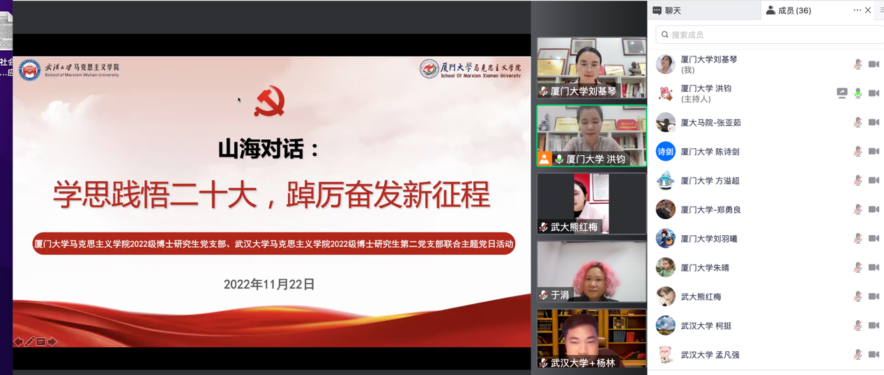 为深入学习宣传党的二十大精神, 11月22日晚,厦门大学马克思主义学院2022级博士研究生党支部与武汉大学马克思主义学院2022级博士研究生第二党支部相聚云端,联合举办了“山海对话:学思践悟二十大,踔厉奋发新征程”主题党日活动。本次活动由厦门大学马克思主义学院2022级博士研究生党支部书记洪钧主持。