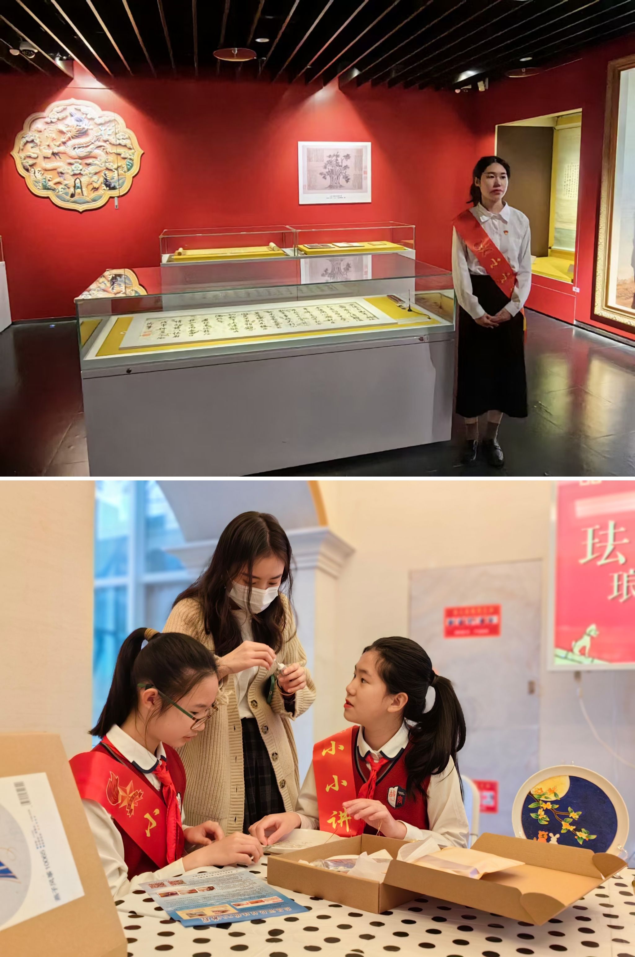 在文物讲解体验活动正式开始前,文物馆的专业讲解员对大中小学的同学们进行讲解礼仪以及乾隆皇帝御笔书画文物知识的相关培训。在培训结束后同学们按照大中小学的组合分成四个小组,进入笃志经训、敦崇孝悌、绥邦怀远以及文人雅趣四个文物单元进行文文物志愿讲解体验。在文物馆讲解员的带领下,同学们开展文创研学,学习“珐琅寻踪”相关知识,并体验了掐丝珐琅画的文创活动。