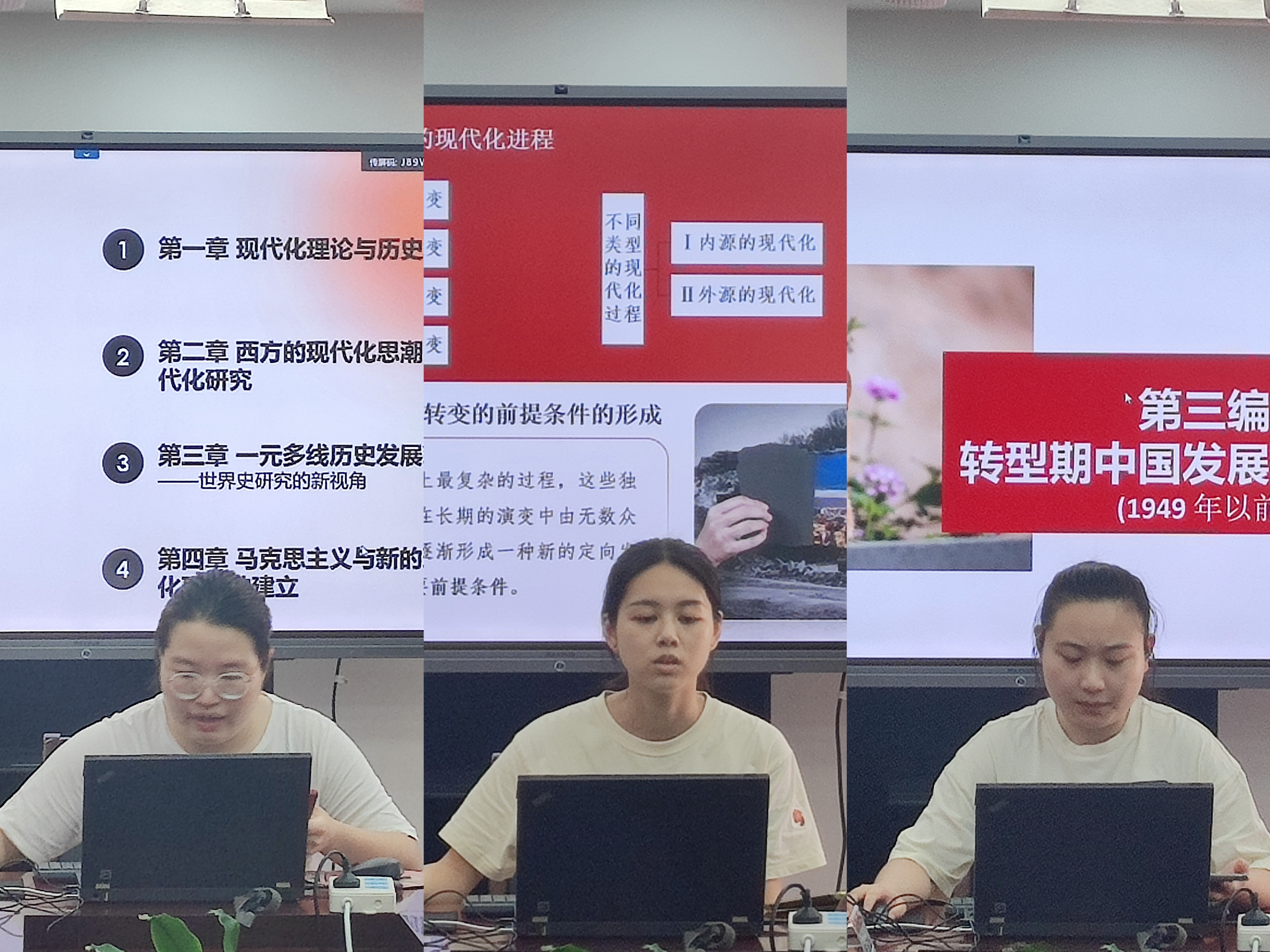 在第一环节“小组导读·钩玄提要”中,三个小组分别选派代表汇报自学情况。黄雅彬重点分析了马克思主义与现代化理论的密切关系,指出马克思的社会发展理论的中心部分正是关于现代社会的发展问题。向敏从全世界、第三世界、东亚地区三个层面梳理现代化进程,指出西方在经济、政治、军事上正在丧失优势,必将面临东亚的新挑战。田姝晴详细列举了中国近百年的现代化思潮与实践演变,指出中国现代化进程具有极大的复杂性、艰巨性、辽阔性。