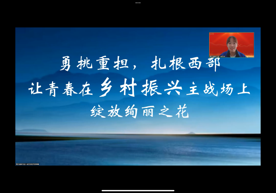 厦门大学第25届研究生支教团先锋党支部书记林艺玲同志作“勇担重任,扎根西部”专题分享。她深情讲述了研究生支教团响应号召、扎根宁夏西海固,服务西部学子成长成才,连续25年投身闽宁协作中的动人故事。支教团发挥厦大人才资源优势,用行动践行“到西部去,到基层去,到祖国最需要的地方去”的铮铮誓言。她勉励同学们,结合自身成长成才需求,将青春汗水挥洒在乡村振兴的火热实践中,让青春在奋斗中迸发出更为强劲的力量。
